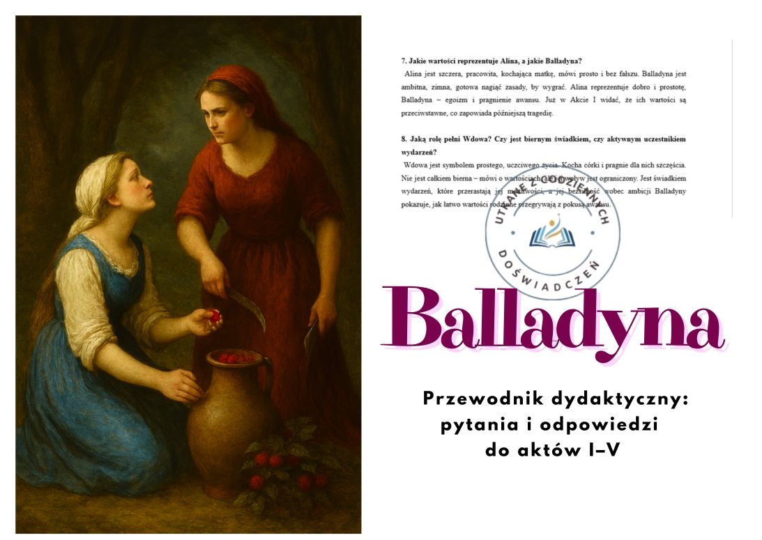 💡 Dlaczego to wyjątkowy materiał? Bo łączy prostotę języka z głębią interpretacji. Uczeń nie czuje się przytłoczony trudnymi słowami, a jednocześnie poznaje pełen sens dzieła. To materiał, który ułatwia naukę, oszczędza czas i sprawia, że „Balladyna” staje się bliska i zrozumiała.