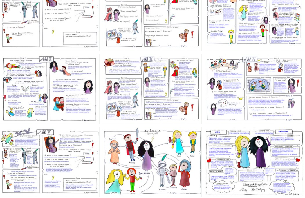Materiał obejmuje streszczenie lektury "Balladyna" w formie podobnej do komiksu - omówienie scena po scenie. Karty pracy puste do wydrukowania dla ucznia oraz kolorowe (wypełnione jako przykład lub materiał do powtórki). Dodatkowo charakterystyka porównawcza głównych bohaterek i relacje między nimi.