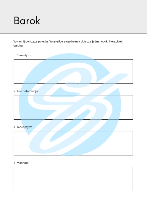 Pakiet „Barok – Najważniejsze Zagadnienia” to dwie karty pracy stworzone z myślą o nauczycielach języka polskiego oraz korepetytorach przygotowujących maturzystów. Zestaw zawiera kluczowe zagadnienia związane z epoką baroku, które uczniowie muszą opanować przed maturą. Zadaniem uczniów jest opisanie poszczególnych zagadnień, a na końcu znajdą proponowane odpowiedzi, które pomogą im w nauce. Karty pracy są doskonałym narzędziem do systematycznego utrwalania wiedzy o baroku i przygotowania do egzaminu maturalnego.