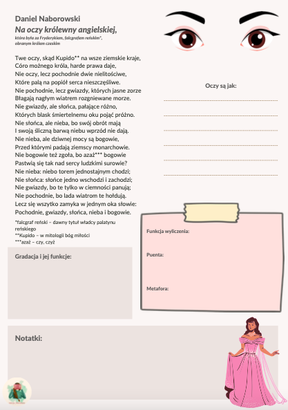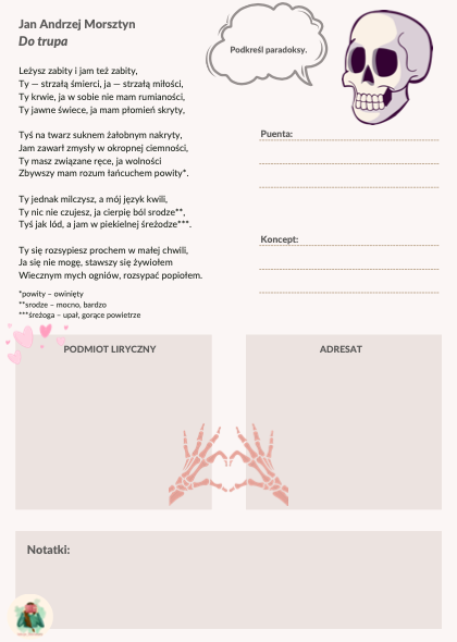Zestaw zawiera teksty utworów i zadania do 8 wierszy barokowych: Daniela Naborowskiego "Krótkość żywota", "Cnota grunt wszystkiemu", "Na oczy królewny angielskiej"; Mikołaja Sępa-Szarzyńskiego "Sonet IV", "Sonet V" oraz Jana Andrzeja Morsztyna "Do trupa", "Do galerników", "Niestatek". Ponadto w zestawie znajdują się karty dotycząca motywów wanitatywnych i środków stylistycznych.