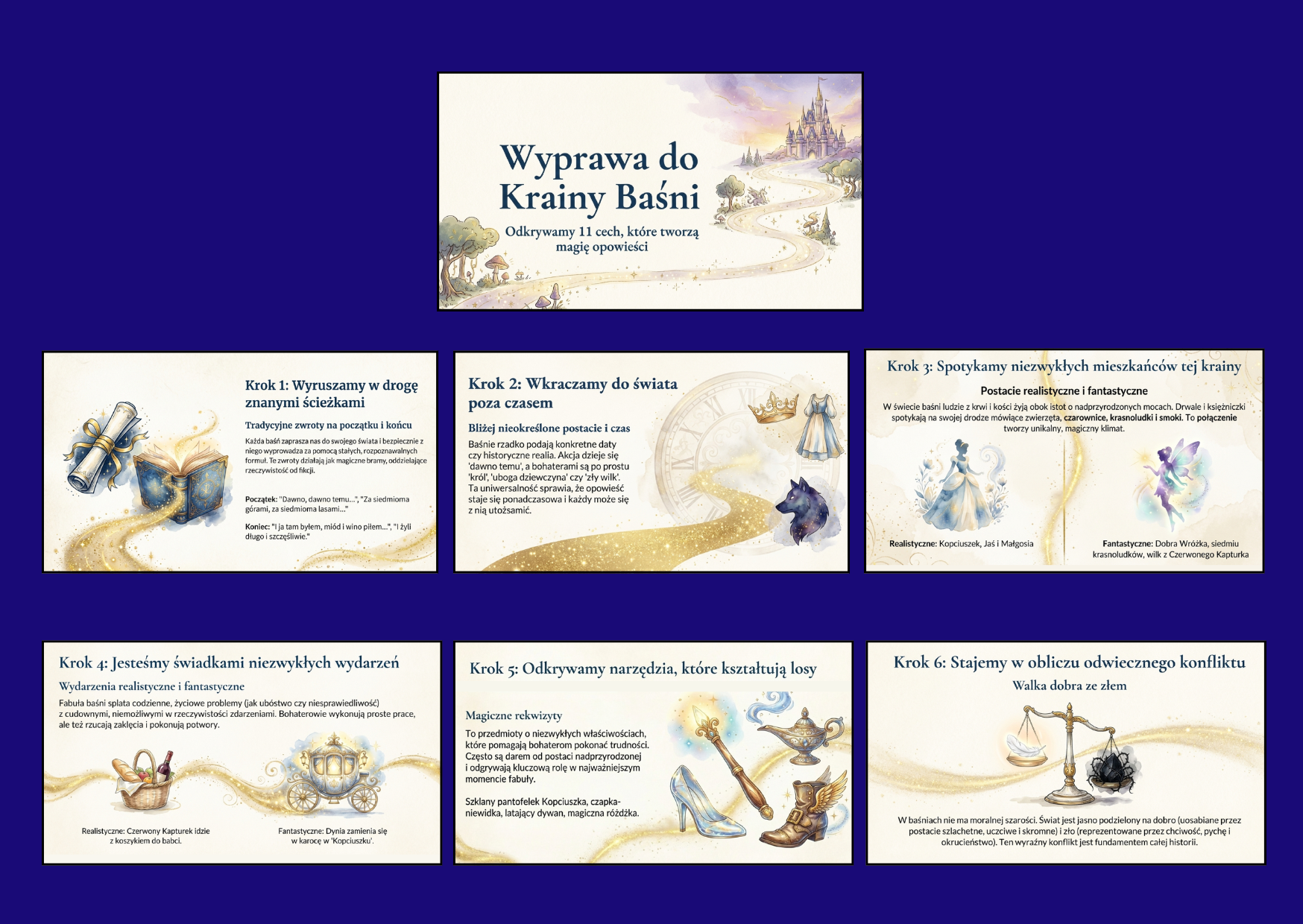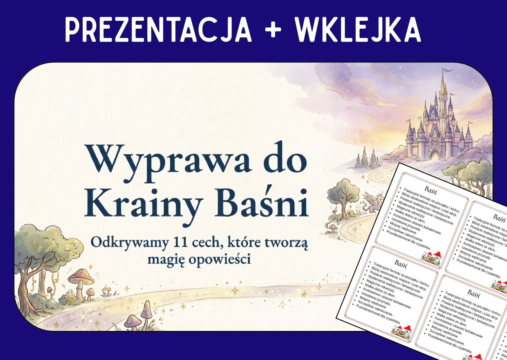 Gotowa prezentacja dydaktyczna dotycząca baśni, omawiająca 11 cech baśni jako gatunku literackiego. Materiał został przygotowany z myślą o uczniach szkoły podstawowej i stanowi czytelne, uporządkowane wprowadzenie do zagadnień teoretycznoliterackich. Dodatkowo: wklejka z cechami baśni. ⭐Zawartość prezentacji: - 13 slajdów, - omówienie 11 najważniejszych cech baśni, - przejrzysta forma ułatwiająca zrozumienie i zapamiętanie treści. ⭐Prezentacja doskonale sprawdzi się: - podczas lekcji języka polskiego, - jako wprowadzenie do omawiania lektur baśniowych, - do utrwalenia wiadomości o gatunkach literackich, - na zastępstwa oraz zajęcia dodatkowe.
