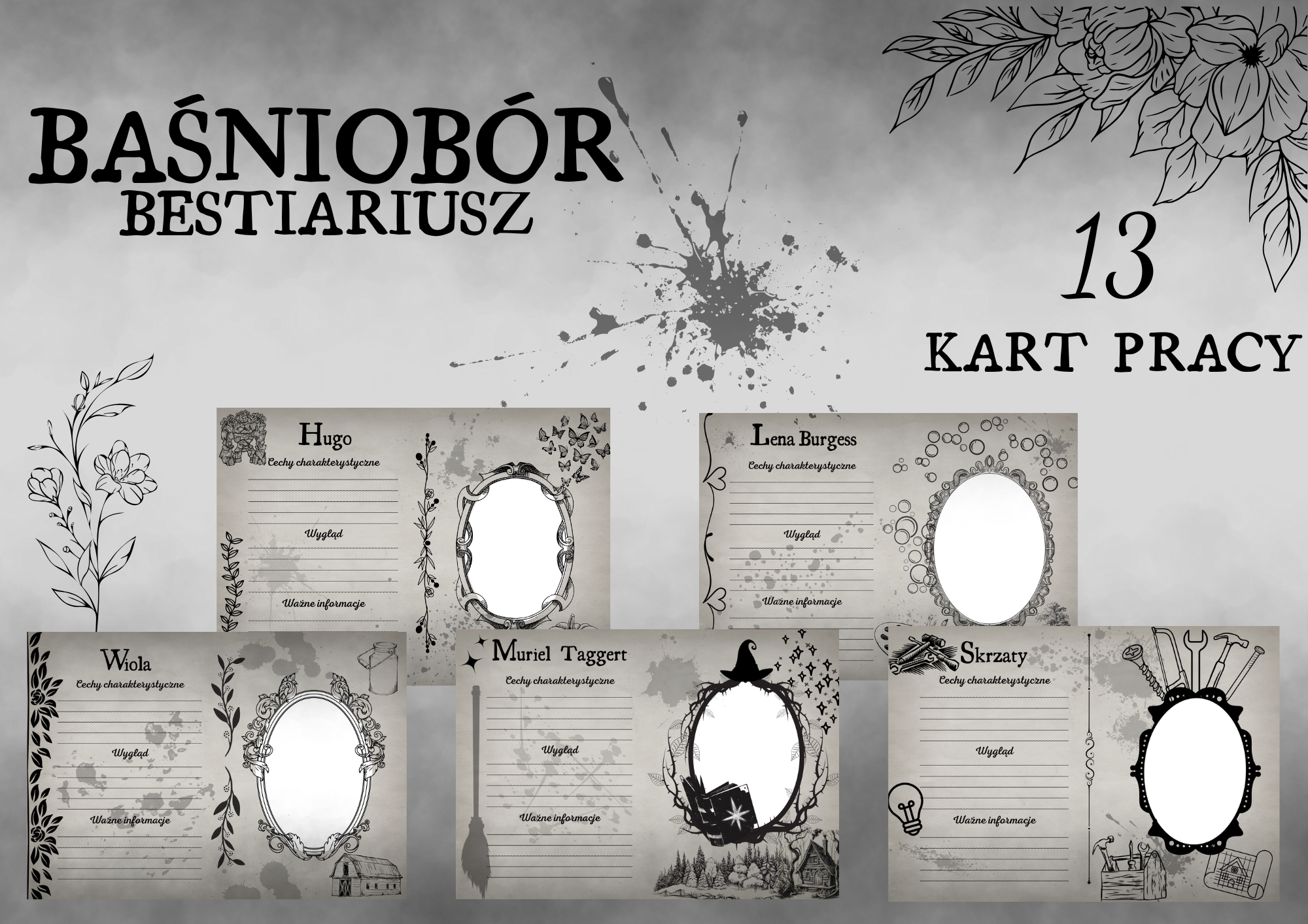 Baśniobór: Bestiariusz to 13 kart pracy, które pozwolą stworzyć piękny, klasowy bestiariusz, zawierający wszystkie postacie z lektury.