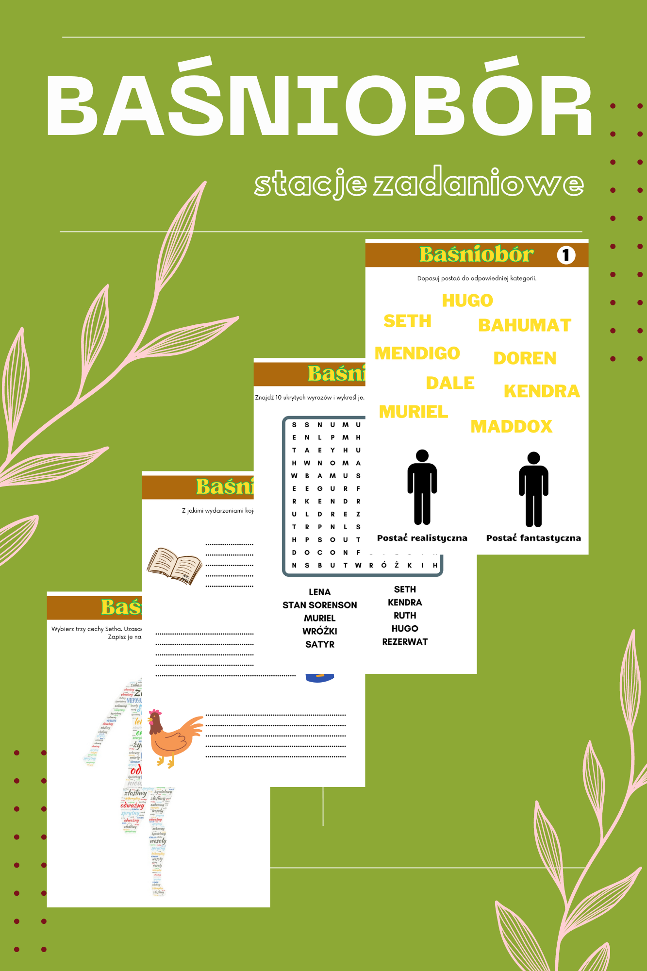 Zestaw zawiera osiem kart z różnymi stacjami zadaniowymi z lektury "Baśniobór".