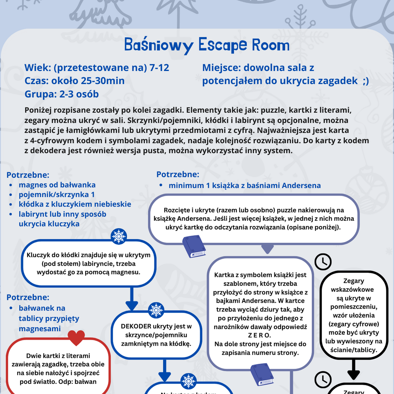 Zestaw (16 stron) zagadek i łamigłówek w klimacie baśni H. Ch. Andersena, do realizacji w dowolnej sali. Nawiązania do takich baśni jak: Zakochany bałwan, Brzydkie Kaczątko, Królowa Śniegu Escape Room dla minimum 7-latków (testowany na 7-12-latkach), przewidywany na około pół godziny gry (wszystko zależy od wieku uczestników oraz wyboru i ukrycia zagadek przez prowadzącego). Są tu takie elementy jak puzzle, kodowanka z dekoderem (do wycięcia i złączenia, np guzikiem), zadanie z zegarami ze wskazówkami, arkusze z zagadką o bałwanku do odczytania pod światło oraz rymowane podpowiedzi. Załączony został regulamin Escape Roomu oraz rozpiska oryginalnej rozgrywki i kolejności zagadek. Do pełnej realizacji potrzebne są dwie sztuki pojemników lub skrzynek, każda do zamknięcia na kłódkę z kluczykiem (polecam oznaczyć jeden zestaw na żółto, drugi na niebiesko). W grze występuje labirynt z ukrytym kluczem - można go zastąpić czymś innym, pominąć, albo wykonać z kartonu i zakryć plexi z antyramy, po której uczestnicy mogą prowadzić magnesem kluczyk. Dodatkowo są tu też proste przepisy na sztuczny śnieg.