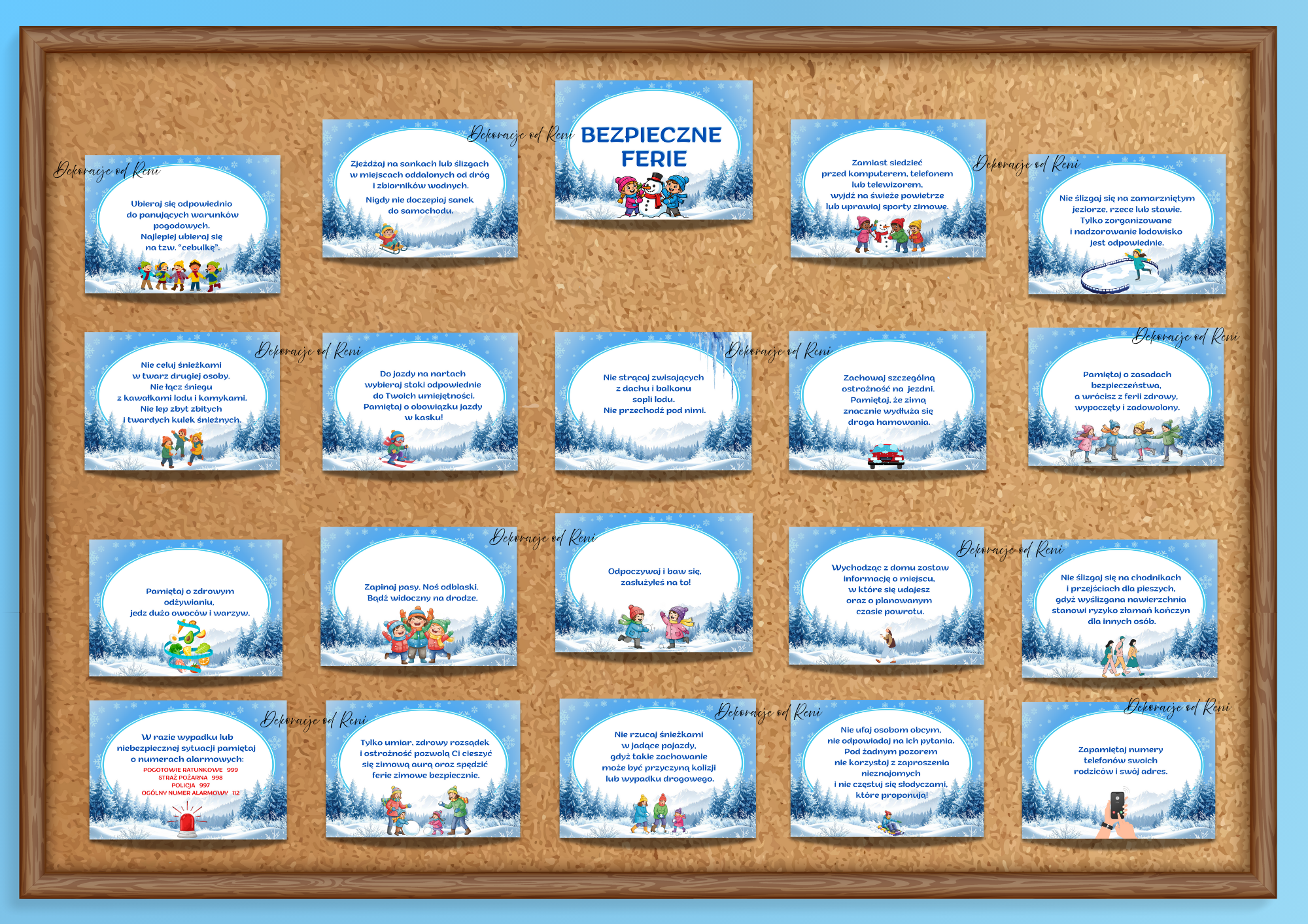 Bezpieczne Ferie to praktyczny zestaw 20 kart z najważniejszymi zasadami bezpiecznego spędzania ferii zimowych. Materiał został przygotowany w formie czytelnych i atrakcyjnych kart edukacyjnych, które pomagają dzieciom lepiej zrozumieć, jak dbać o bezpieczeństwo podczas zimowego wypoczynku.