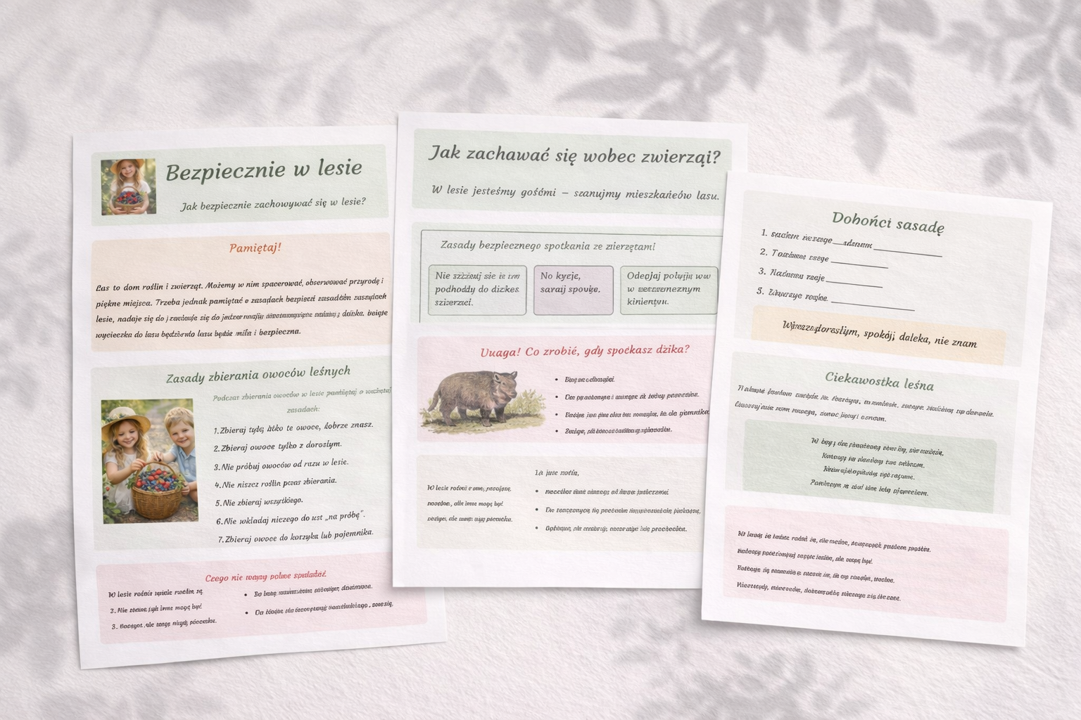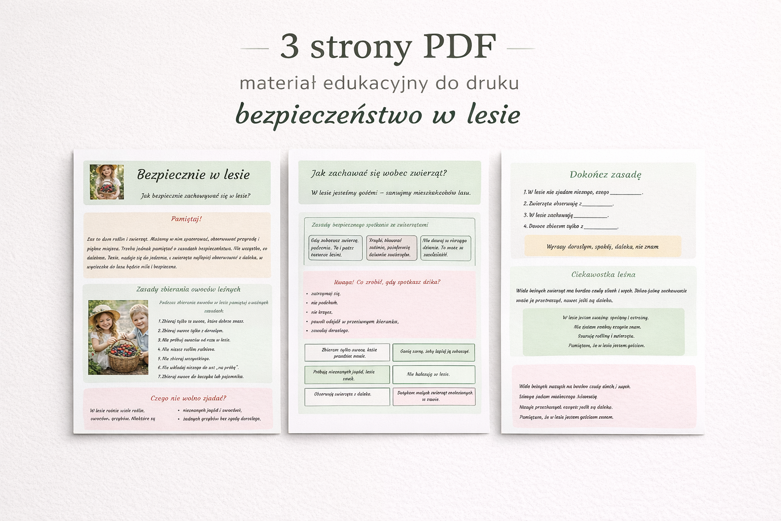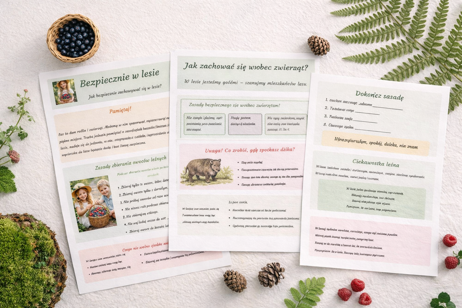 „Bezpiecznie w lesie” wyróżnia się połączeniem edukacyjnej wartości, atrakcyjnej formy i praktycznego zastosowania. To materiał, który można wykorzystać od razu – bez długiego przygotowania, bez tworzenia własnych treści od zera. Wystarczy wydrukować i korzystać. Dzięki temu oszczędzasz czas, a jednocześnie oferujesz dziecku coś naprawdę wartościowego, mądrego i dopracowanego.