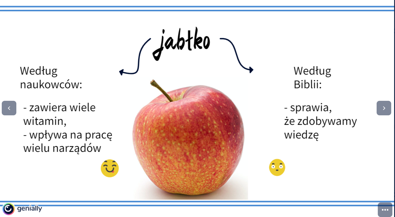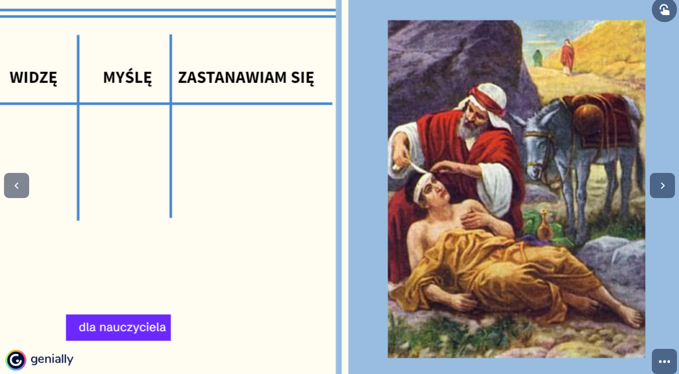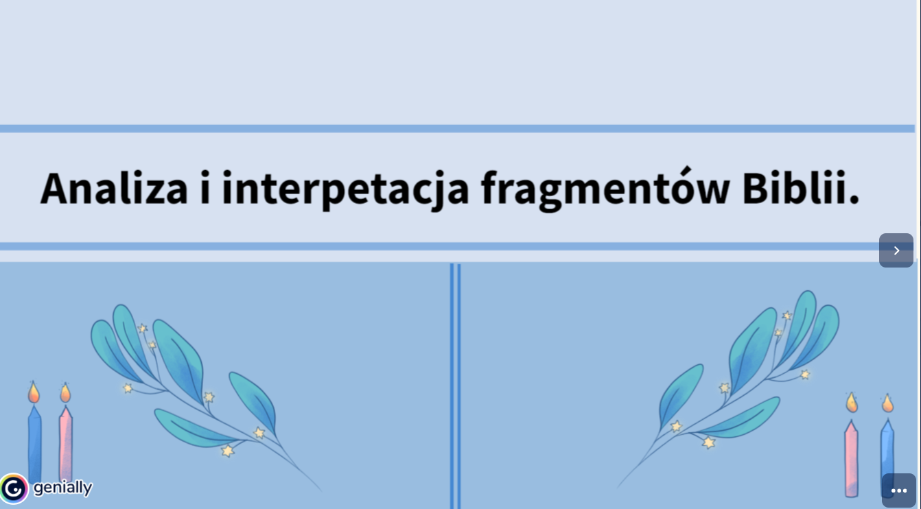 Prezentacja została wykonana w programie Geniall.ly Nie znajdziecie tu opracowań biblijnych historii, ale pomysły na lekcje skierowane do klasy 5. Zgodnie z pp, omawiamy mit o stworzeniu świata oraz przypowieści (o siewcy, o talentach, o pannach roztropnych i o miłosiernym samarytaninie). Nie skupiamy się jednak tylko na treści. Podpowiadam ciekawe rozwiązania, oparte na myśleniu krytycznym, rozwijaniu kompetencji kluczowych, kształtowaniu umiejętności czytania ze zrozumieniem i notowania. Znajdziecie tu: test czujności, zakodowane frazeologizmy, domino.