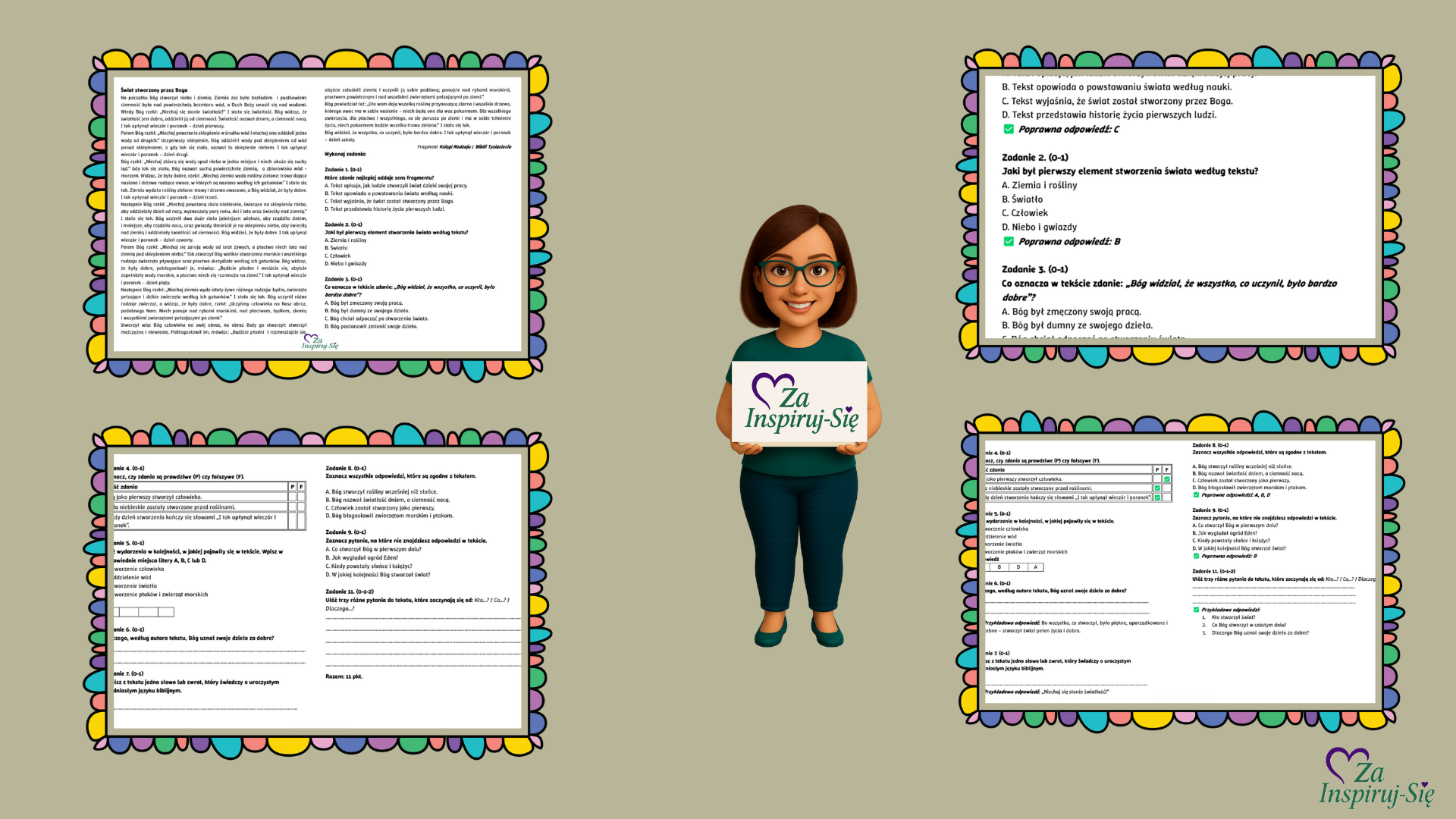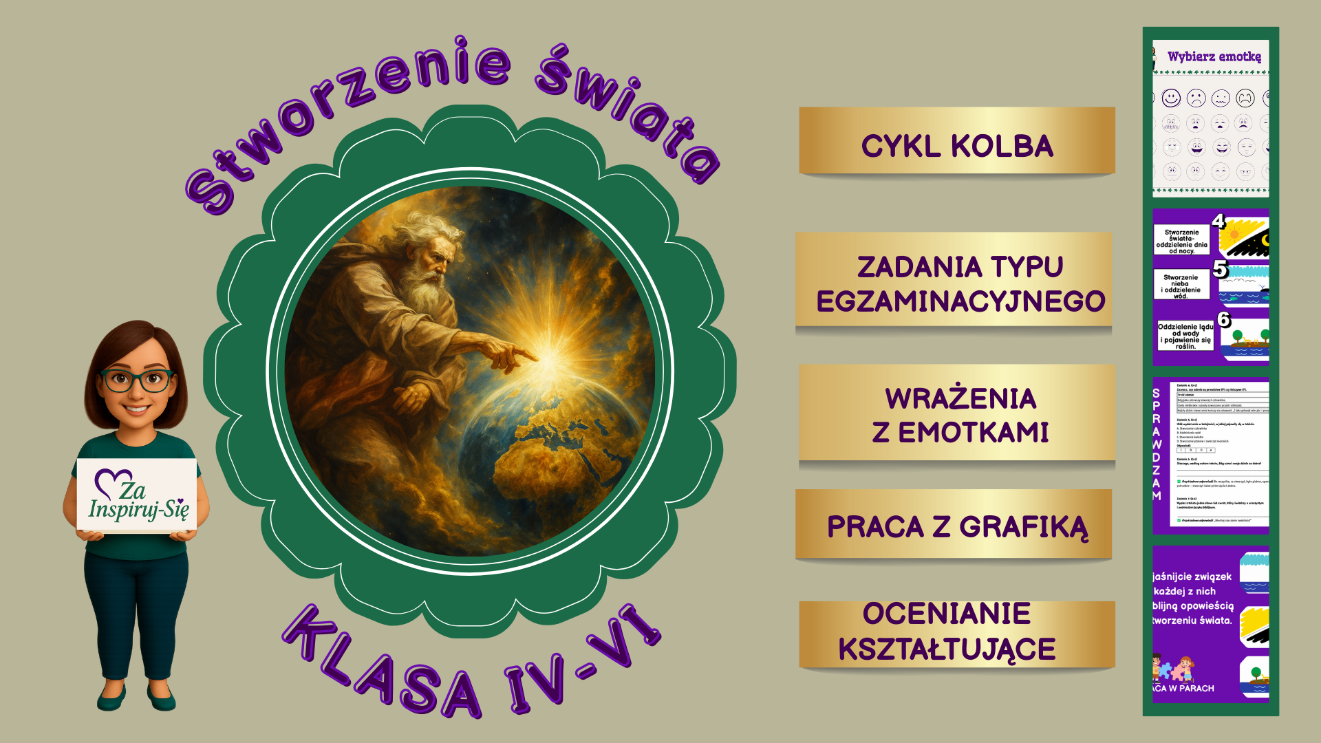 Materiał dotyczy biblijnej opowieści o stworzeniu świata (Biblia, Stary Testament, Księga Rodzaju). Uczniowie poznają kolejne dni stworzenia, ćwiczą czytanie ze zrozumieniem, rozwiązując zadania typu egzaminacyjnego, uczą się porządkować informacje z tekstu, interpretować grafikę oraz nazywać swoje wrażenia i emocje po kontakcie z tekstem i obrazem. Lekcja przygotowana jest według cyklu Kolba i zgodnie ze strategiami oceniania kształtującego.