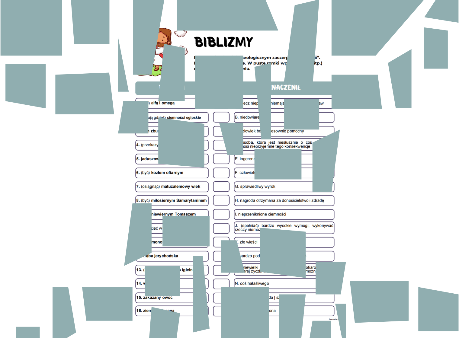 To prosta, jednostronicowa karta pracy, na której uczniowie dopasowują biblizmy do ich znaczeń, dzięki czemu widzą, jak „język Biblii” żyje w codziennych powiedzeniach. Jak wygląda zadanie Na jednej liście znajdują się wyrażenia (m.in. „wdowi grosz”, „zakazany owoc”, „ziemia obiecana”, „salomonowy wyrok”, itp.”), a obok nich – zestaw krótkich definicji oznaczonych literami. Uczeń czyta biblizmy i w puste pola wpisuje literę odpowiadającą właściwemu objaśnieniu, dzięki czemu ćwiczy zarówno rozumienie, jak i zapamiętywanie znaczeń. ​ Zastosowanie na lekcji Karta świetnie sprawdzi się jako szybkie sprawdzenie wiedzy po wprowadzeniu biblizmów, praca domowa lub „wejściówka” na początku lekcji. Można też zamienić ją w mini‑konkurs: uczniowie pracują w parach, a nauczyciel na końcu razem z klasą omawia najtrudniejsze skojarzenia i nawiązuje do biblijnych historii stojących za wyrażeniami. Materiał pozwala na zrealizowanie Podstawy Programowej (z dnia 28 czerwca 2024 r.) na lekcjach języka polskiego do szkoły podstawowej w celach szczegółowych dla klas IV-VI - kształcenie językowe | zróżnicowanie języka, uczeń: 5) rozpoznaje w wypowiedziach związki frazeologiczne, rozumie ich znaczenie oraz poprawnie stosuje w wypowiedziach.