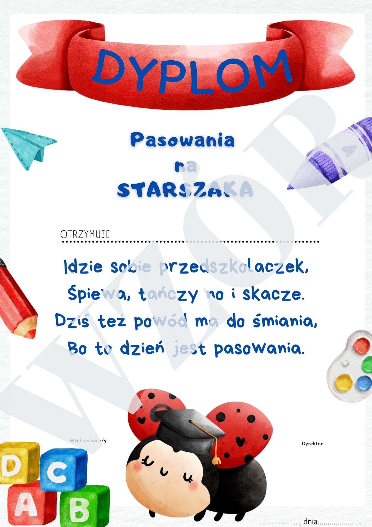 Dyplom pasowanie na przedszkolaka - 33 strony a w nich; - 5 wersji dyplomu pasowanie na przedszkolaka -medale z okazji pasowania - girlanda; Pasowanie na przedszkolaka -pudełko na słodkości 2/3 cukierki jako słodki upominek - opaska na głowę
