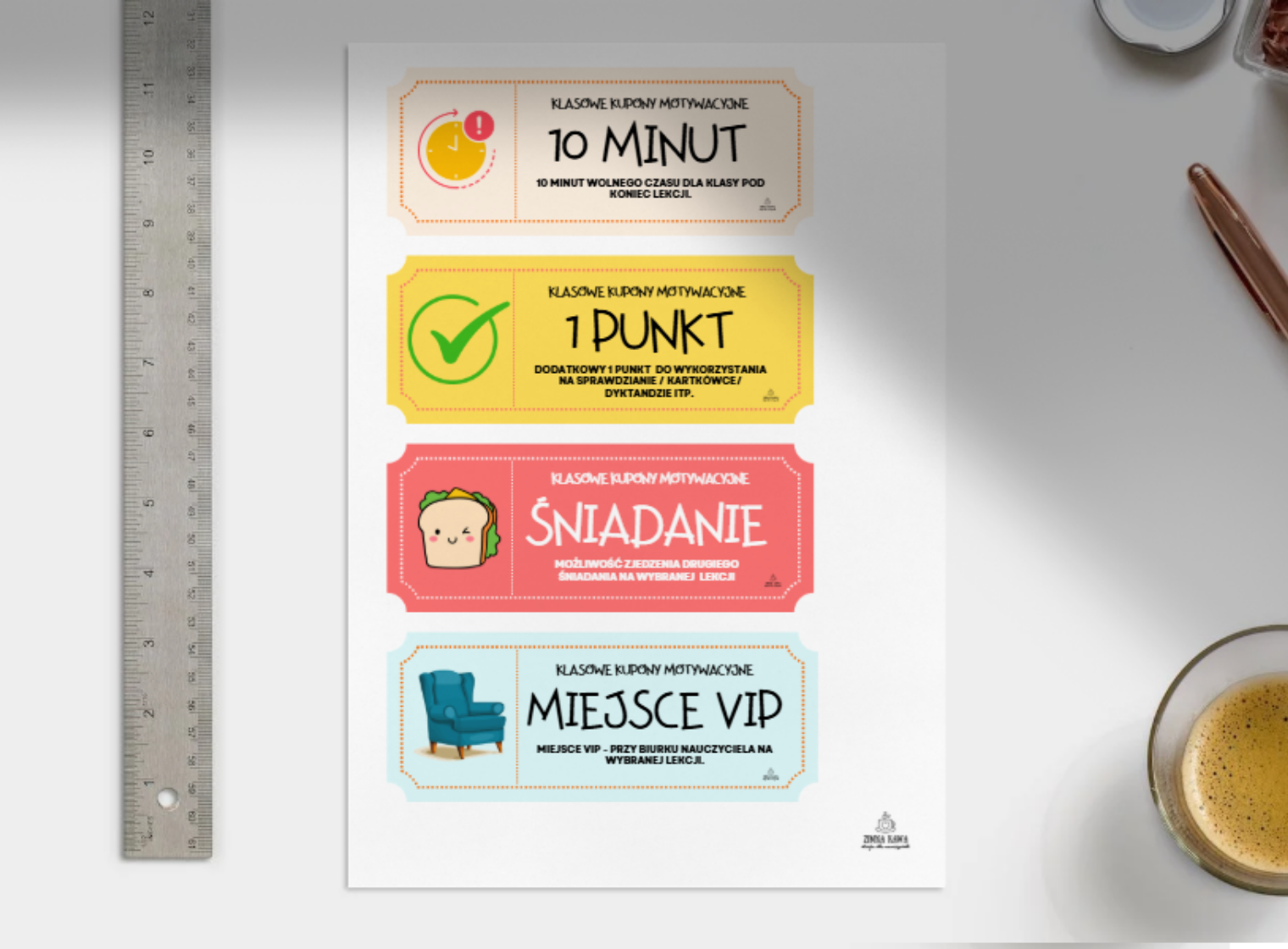 Zestaw kolorowych bilecików, w formie vouchera - który można wykorzystać w formie nagrody dla uczniów. Dzięki nim, wprowadzamy do klasy element zabawy, wzmacniamy pozytywne zachowania i zachęcamy dzieci do większego zaangażowania w naukę.