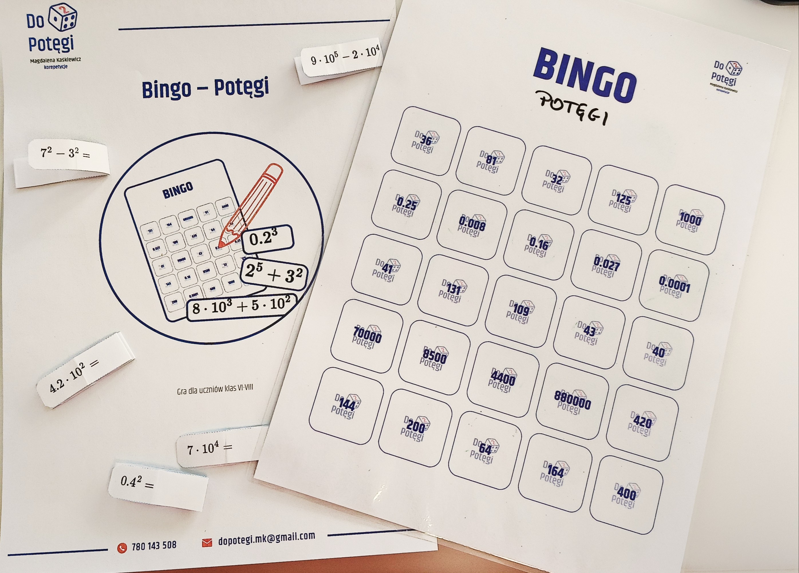 Gra „Bingo – Potęgi” została stworzona, aby w atrakcyjny sposób utrwalać umiejętność potęgowania liczb. Uczniowie rozwijają sprawność rachunkową, koncentrację oraz umiejętność rozpoznawania potęg liczb całkowitych, ułamków oraz liczb dziesiętnych. Gra doskonale sprawdza się zarówno na lekcjach matematyki, jak i podczas zajęć dodatkowych czy powtórzeniowych.