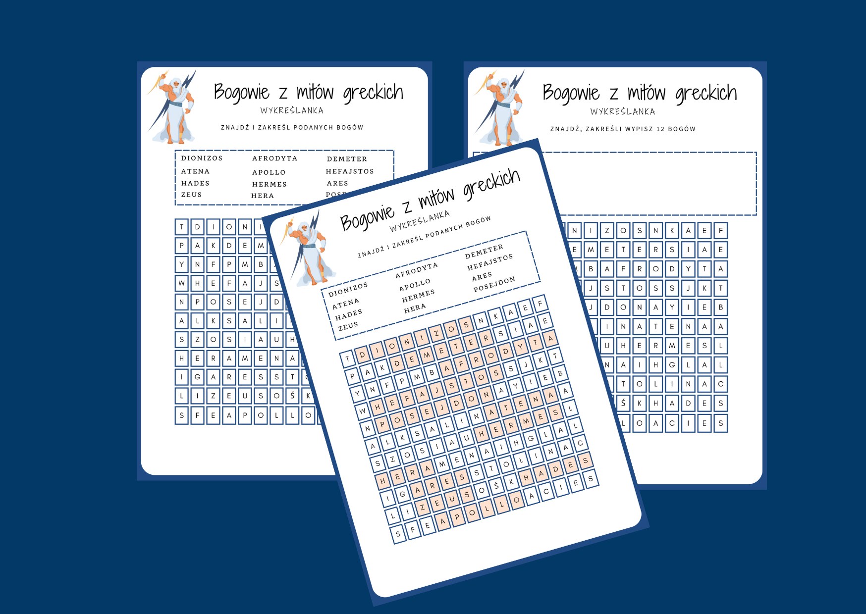 Materiał zawiera wykreślankę dotyczącą bogów z mitów greckich (3 wersje: z odpowiedziami, bez odpowiedzi, bez wyrazów do odnalezienia). Po odnalezieniu wyrazów można je wykorzystać np. do ćwiczeń powtórkowych.