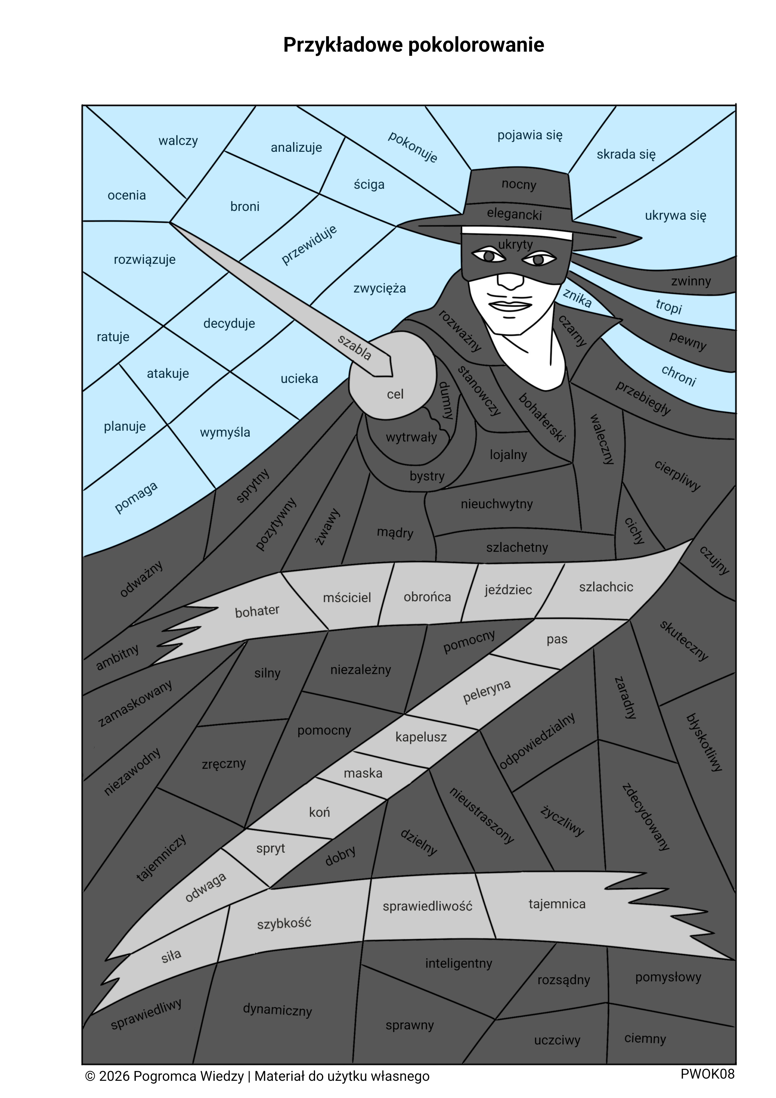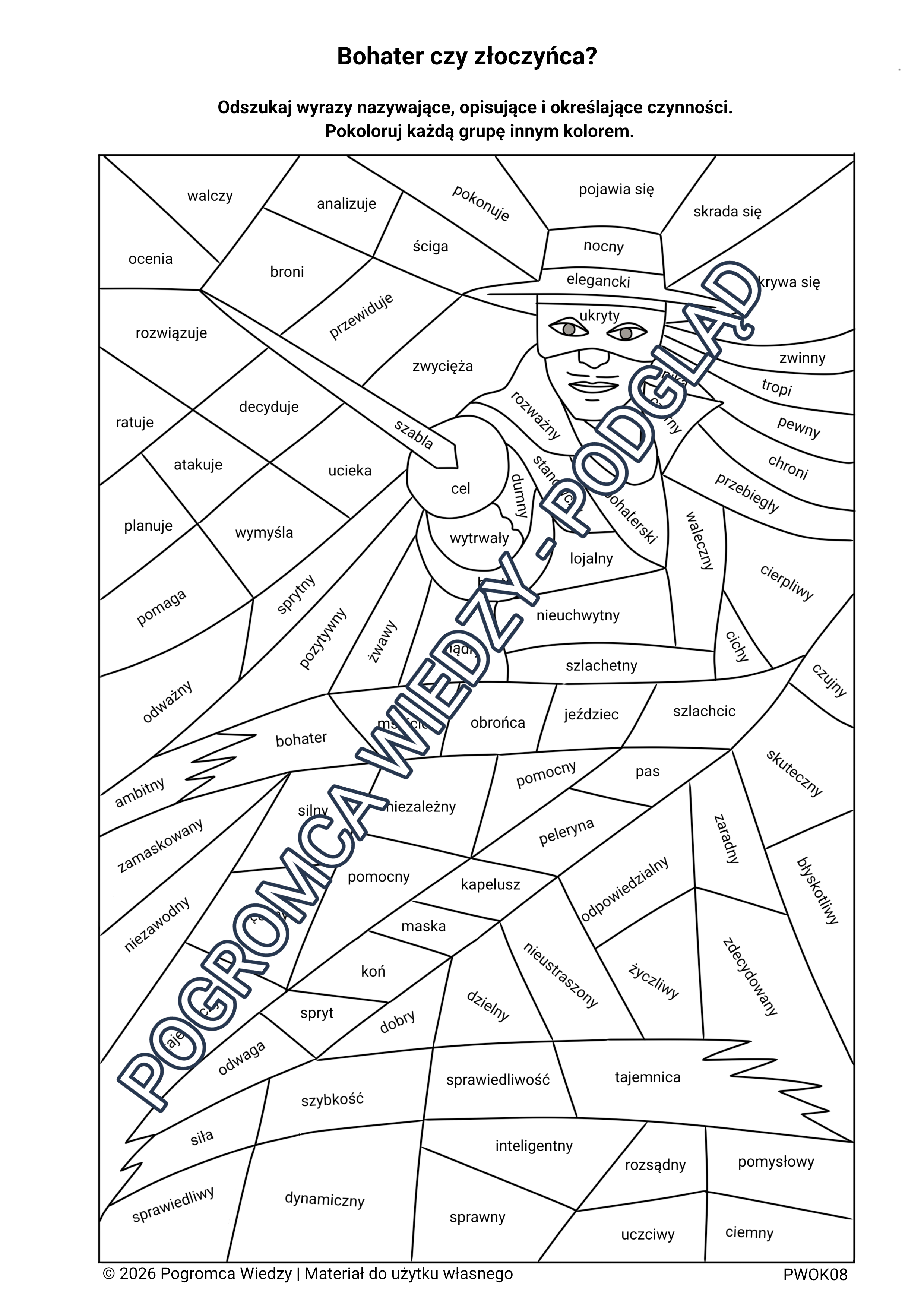 Karta pracy typu kolorowanka edukacyjna rozwijająca słownictwo i umiejętność opisywania postaci. Uczniowie wyszukują wyrazy nazywające, opisujące oraz określające czynności, a następnie porządkują je poprzez kolorowanie. Materiał może być wykorzystany jako wstęp do rozmowy o tym, kim jest bohater i czy zawsze jest on jednoznacznie dobry lub zły.