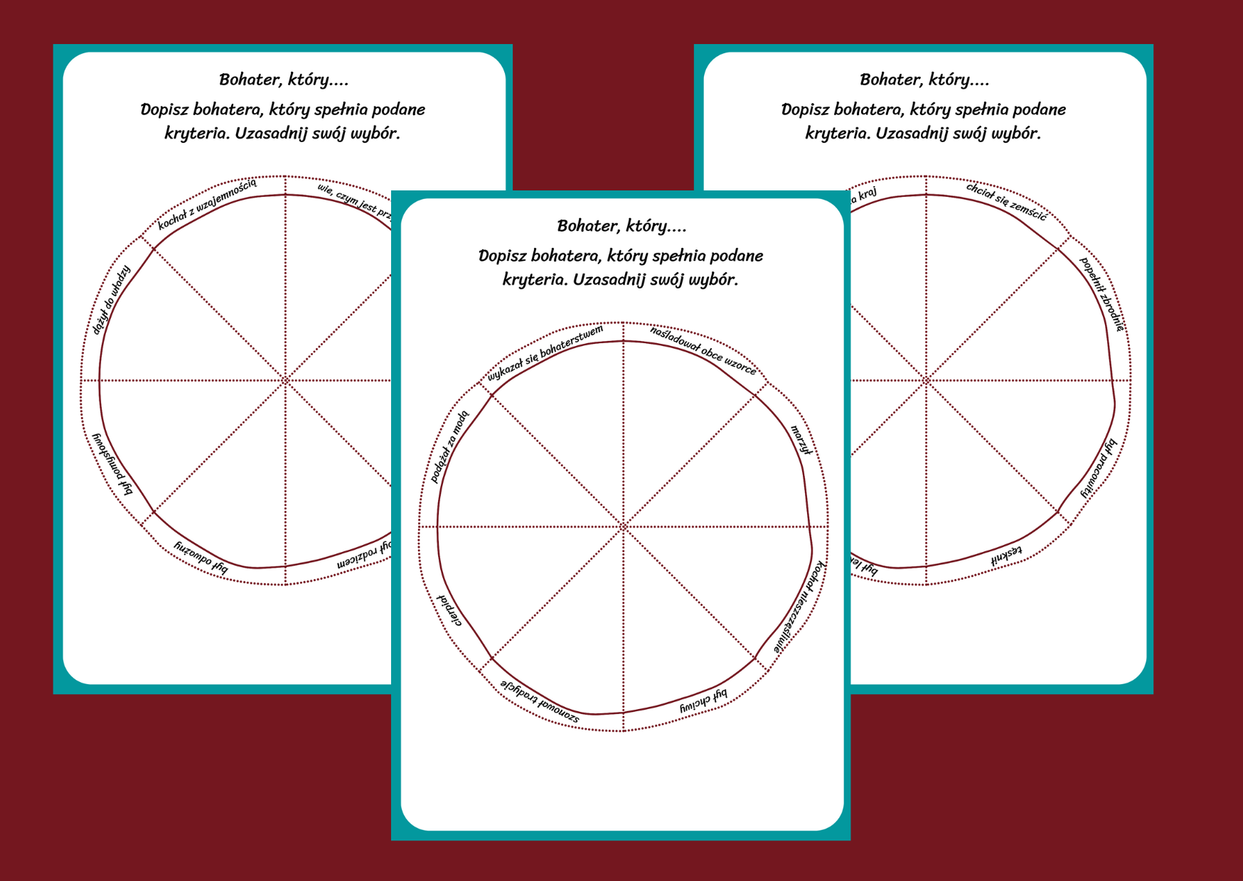 Zestaw 5 kart pracy ( + jedna pusta, do dowolnego uzupełnienia) w nietypowej formie ( kształt koła, pizzy - można wykorzystać na Dzień Pizzy). Po wydrukowaniu karty należy rozdać uczniom, można je dowolnie podzielić, np. rozdać różne grupom, całe lub od razu wycięte na trójkąty. Zadanie polega na dopisaniu bohaterów literackich, spełniających podane kryteria i uzasadnieniu swojego wyboru (pisemnie na karcie pracy lub ustnie).