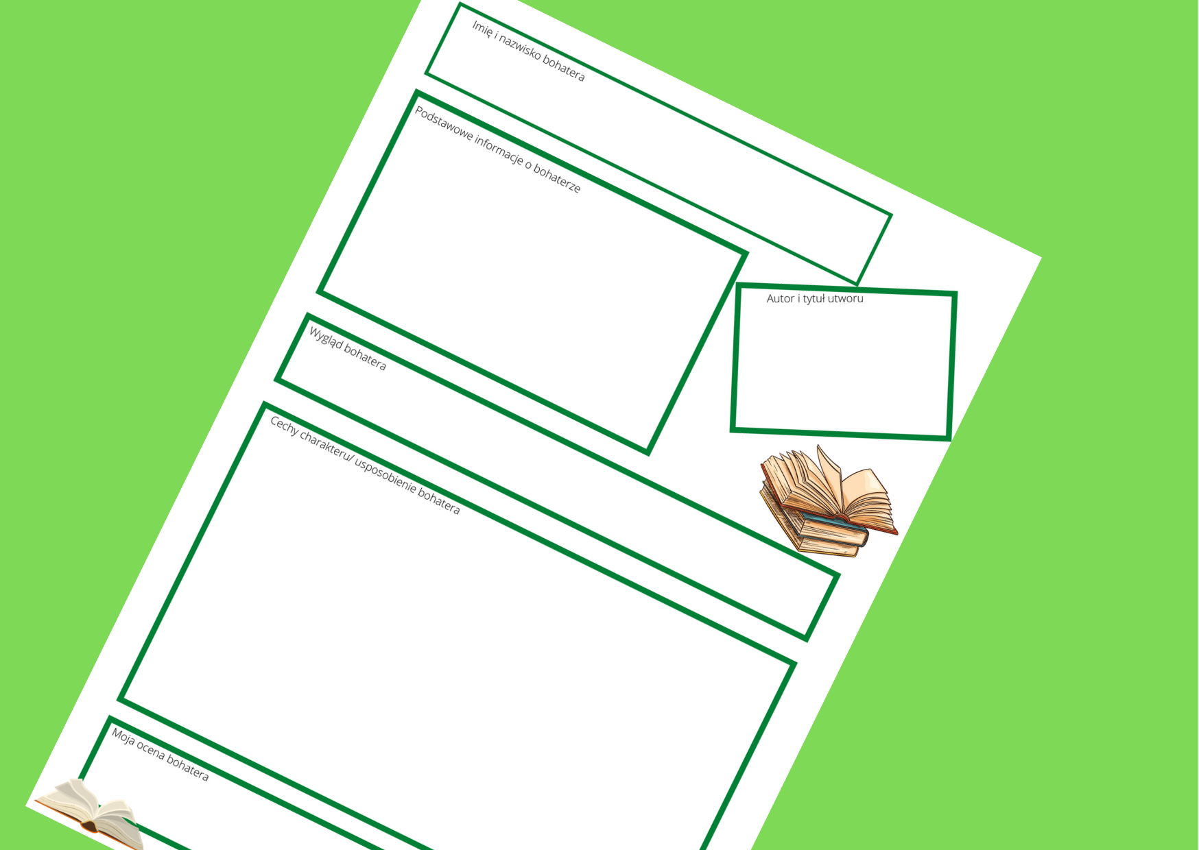 Uniwersalna 1 karta pracy dotycząca charakterystyki bohatera literackiego. Uczeń uzupełnia podstawowe informacje postaci literackiej.