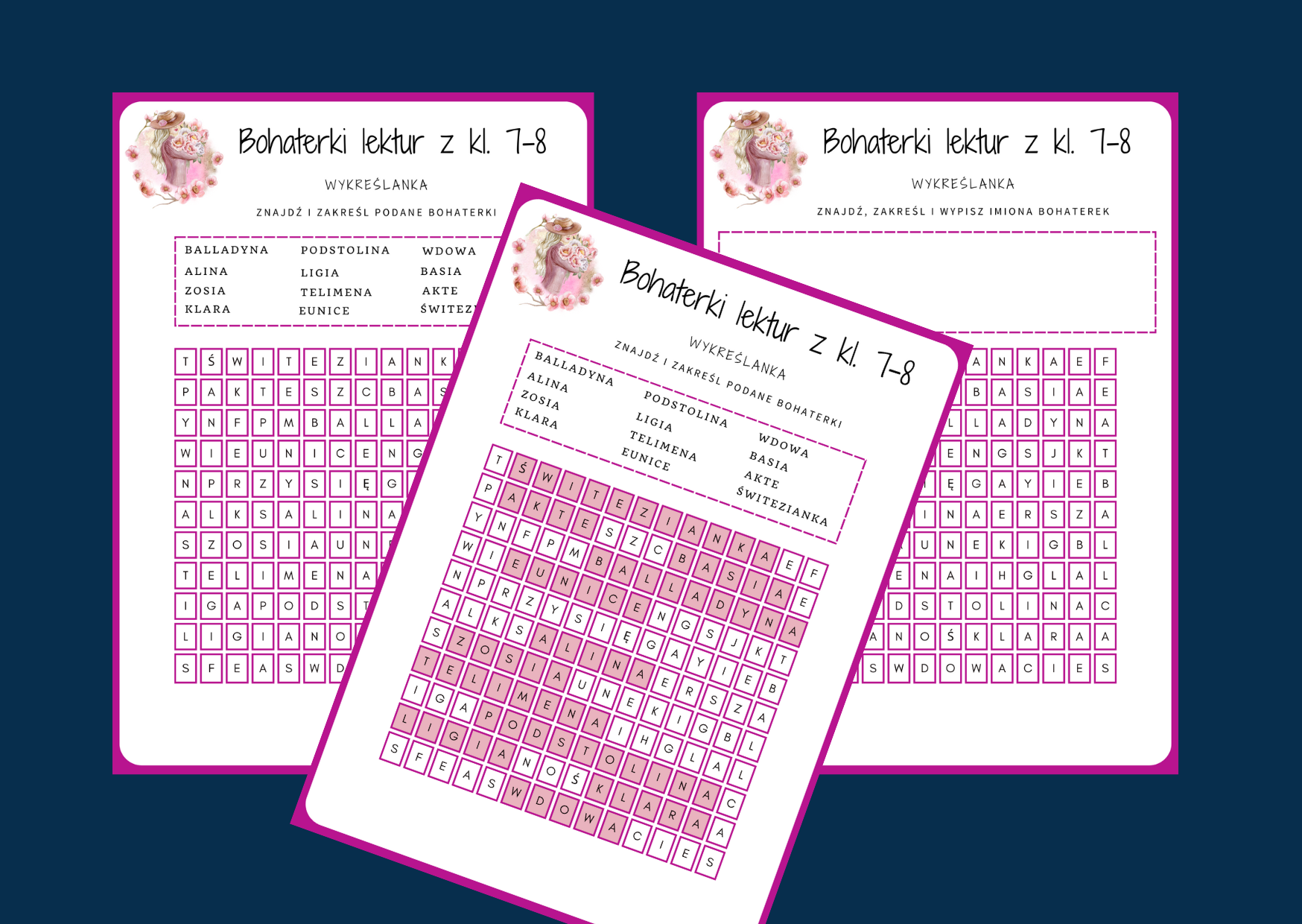 Materiał zawiera wykreślankę dotyczącą bohaterek lektur z klas 7-8 (3 wersje: z odpowiedziami, bez odpowiedzi, bez wyrazów do odnalezienia). Po odnalezieniu wyrazów można je wykorzystać np. do ćwiczeń powtórkowych - uczeń po odnalezieniu bohaterek wskazuje autora i tytuł lektury, z której pochodzą, może także krótko je opisać.