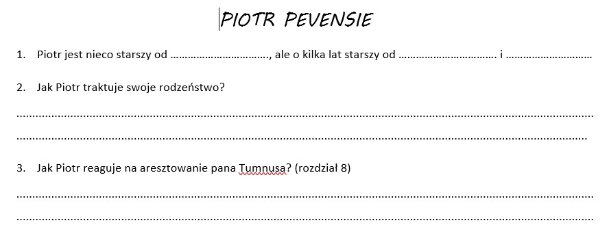 KARTA PIOTRA zawiera pytania dotyczące wieku, relacji z rodzeństwem, reakcji na aresztowanie Tumnusa, jego udziału w bitwie, przyszłości w Narnii oraz jaki był jako dorosły człowiek. Część pytań ma wskazane rozdziały, w których należy szukać odpowiedzi. Ostatnie zadanie zawiera cytaty dotyczące bohatera, które należy zinterpretować i wywnioskować, o jakiej cesze chrakteru świadczą.