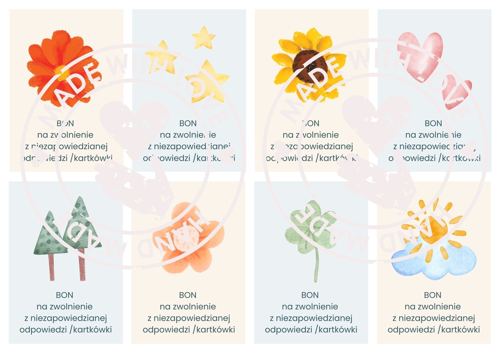 Bon na zwolnienie z niezapowiedzianej odpowiedzi/kartkówki – pozwala uniknąć jednej niezapowiedzianej formy sprawdzania wiedzy (ustnej odpowiedzi lub kartkówki).