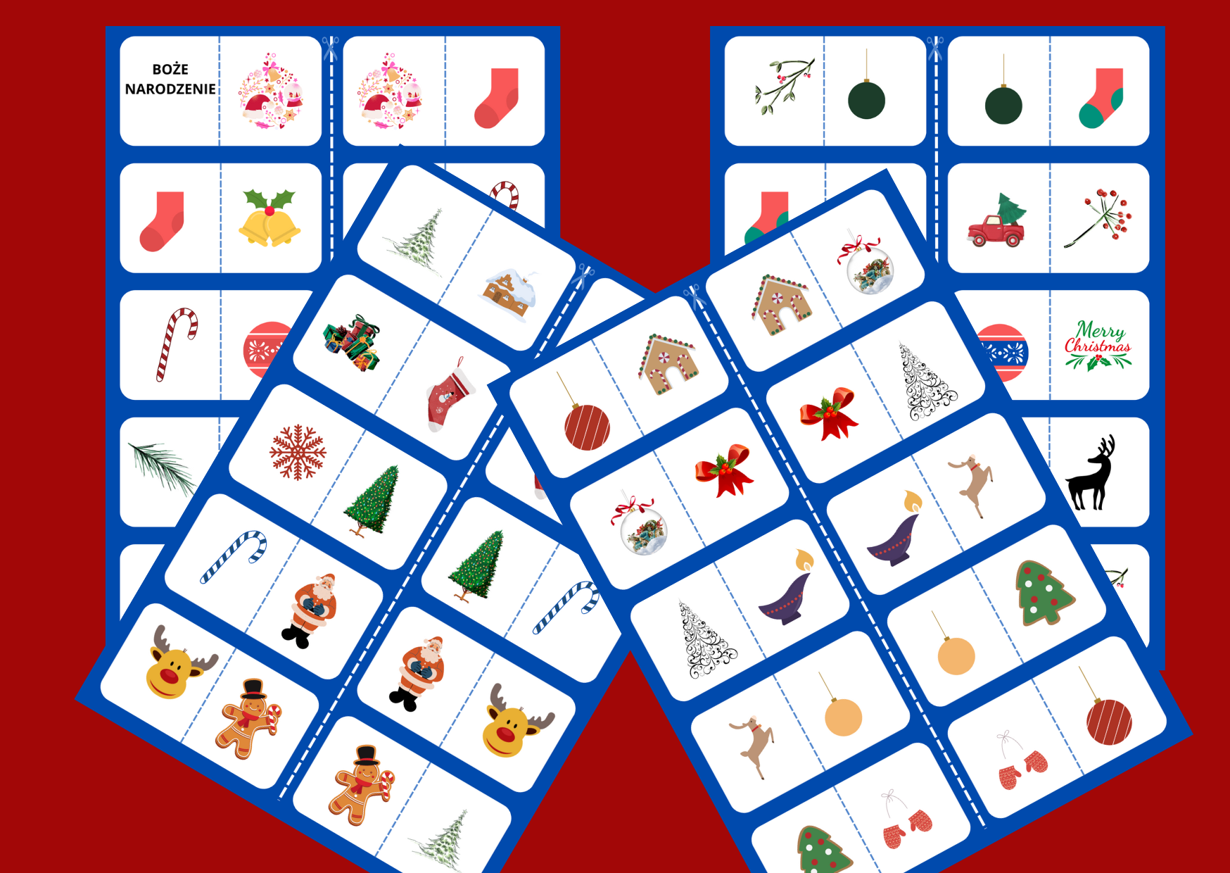 Zestaw „Domino – Boże Narodzenie” zawiera 8 kart po 10 karteczek domina.