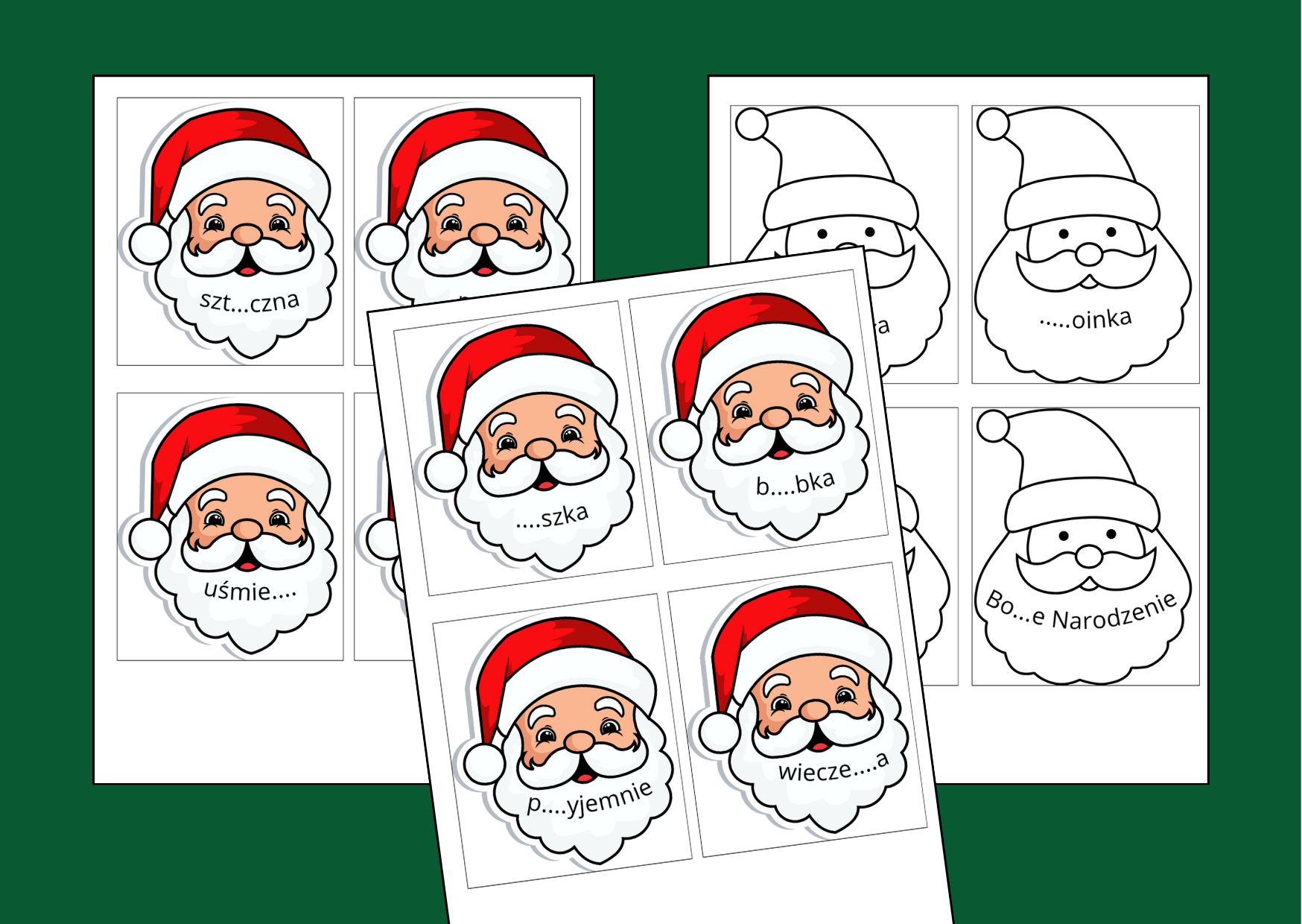 8 stron z 32 fiszkami, na których znajdują się wyrazy związane z Bożym Narodzeniem z trudnością ortograficzną do uzupełnienia. Materiał zawiera 2 wersje kart - kolorową i czarno-białą (łącznie 16 stron). Przed użytkowaniem warto je zalaminować albo potraktować jako karty pracy i wklejki do uzupełnienia pisemnego (wówczas można zmniejszyć format przy drukowaniu).
