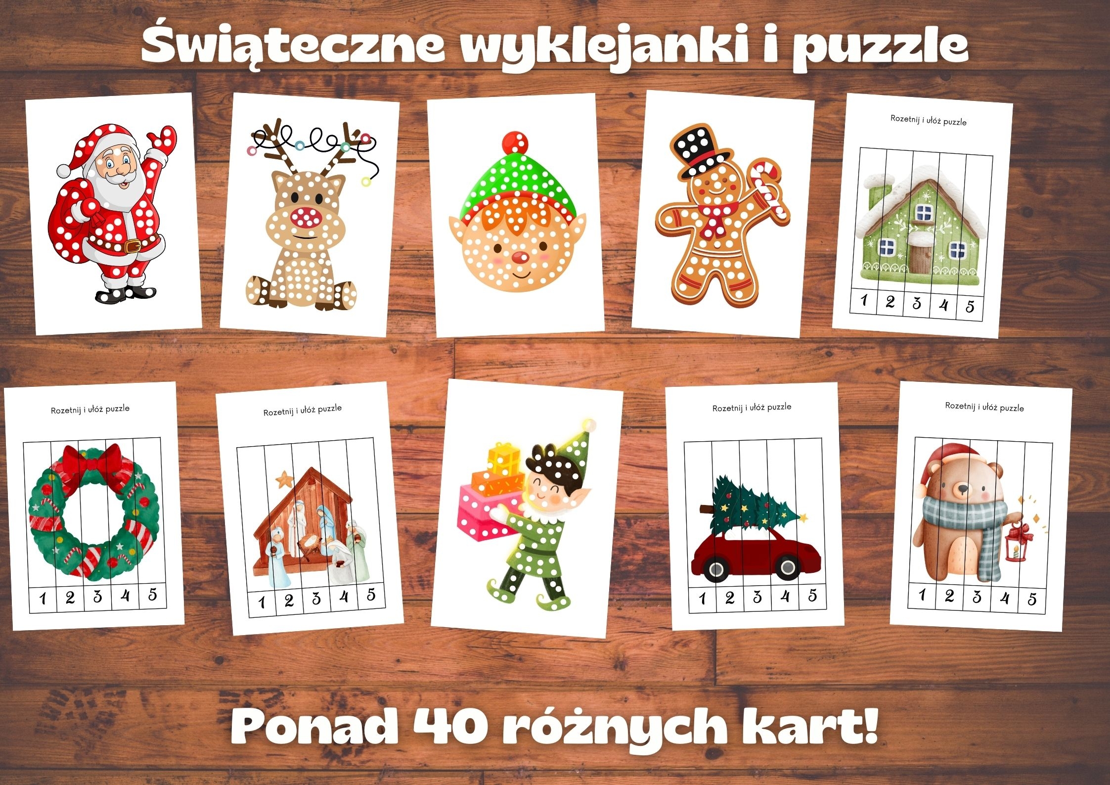 2. Puzzle, które można dać dziecku rozcięcia i ułożenia. Można je rozciąć samemu, zalaminować i wykorzystywać wielokrotnie podczas zajęć o tematyce świątecznej (19 kart).