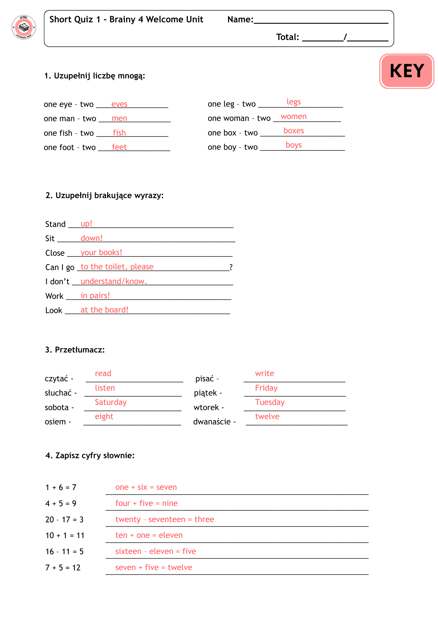 Przygotowałam zestaw 16 kartkówek do podręcznika Brainy 4 – od Welcome Unit aż po dział 8.