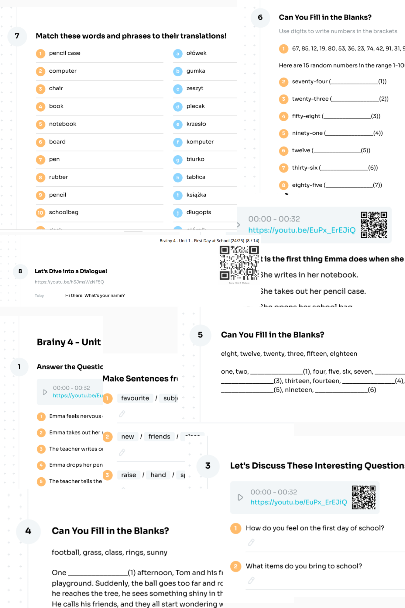 Materiał został opracowany na podstawie działu pierwszego z podręcznika Brainy 4. Całe słownictwo z tego działu w postaci testów możesz znaleźć tutaj. Niniejszą kartę pracy możesz wykorzystać do przeprowadzenia całej lekcji w zakresie słuchania, czytania, konwersacji, słownictwa oraz pisania. Możesz też podzielić lekcję na ćwiczenie każdej z tych umiejętności z osobna, gdyż każde zadanie zostało umieszczone na osobnej stronie.
