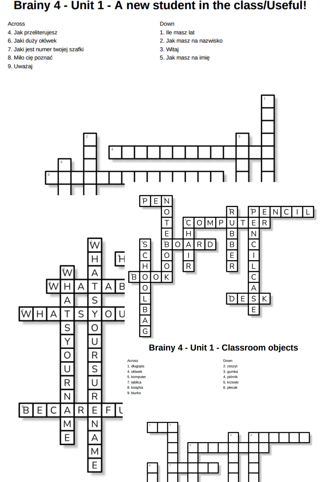 Zestaw zawiera 2 krzyżówki obejmujące słówka z działu pierwszego do podręcznika Brainy 4: