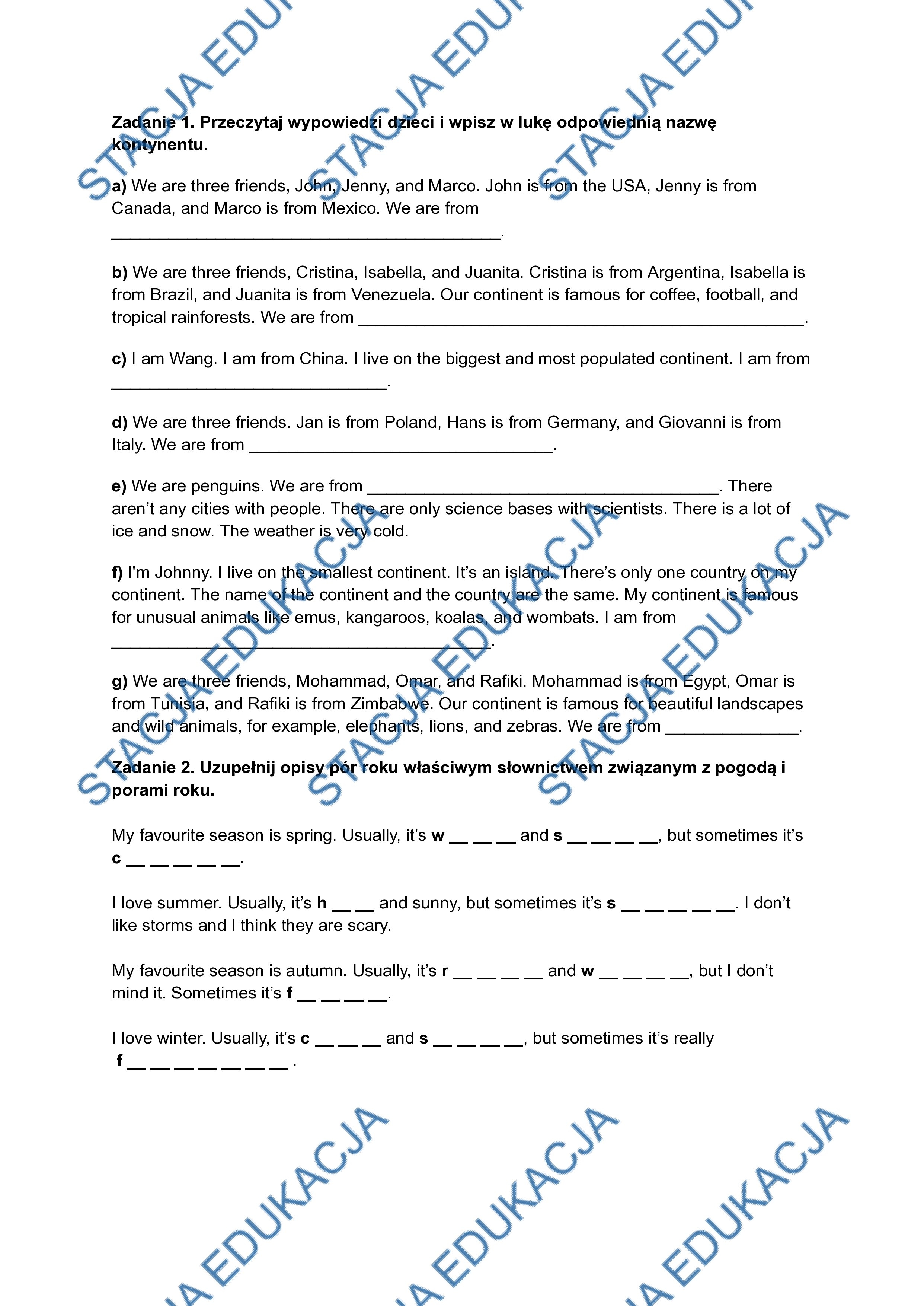 Ta karta pracy zawiera zestaw różnorodnych ćwiczeń językowych dla uczniów na poziomie podstawowym, kompatybilnych z podręcznikiem Brainy 5 Unit 1 wydawnictwa Macmillan. Zadania pomagają rozwijać umiejętności językowe poprzez dopasowywanie nazw kontynentów, uzupełnianie słownictwa związanego z porami roku, formułowanie dialogów oraz stosowanie poprawnych form czasowników. Znajdziesz tu również ćwiczenia gramatyczne dotyczące czasowników "have got" i "to be", oraz pytania wprowadzające do opisywania osób.