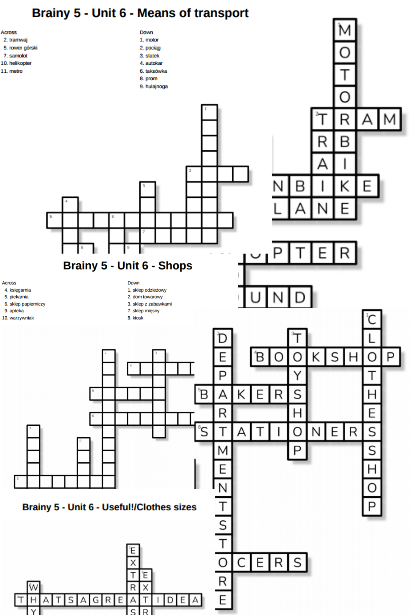 Zestaw zawiera 3 krzyżówki obejmujące słówka z działu szóstego do podręcznika Brainy 5: