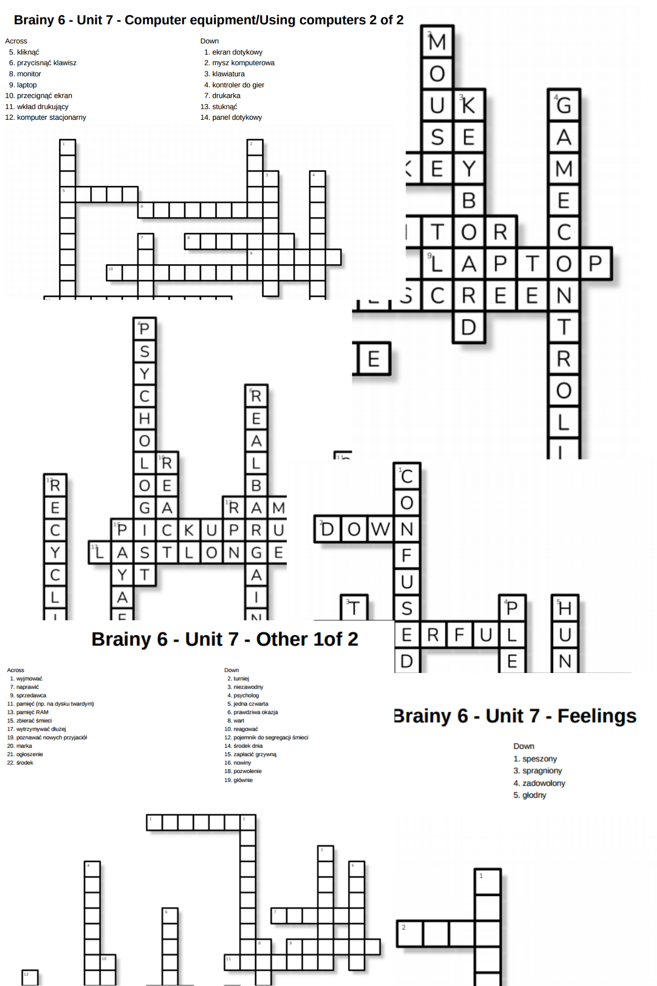 Zestaw zawiera 5 krzyżówek obejmujące słówka z działu siódmego do podręcznika Brainy 6: