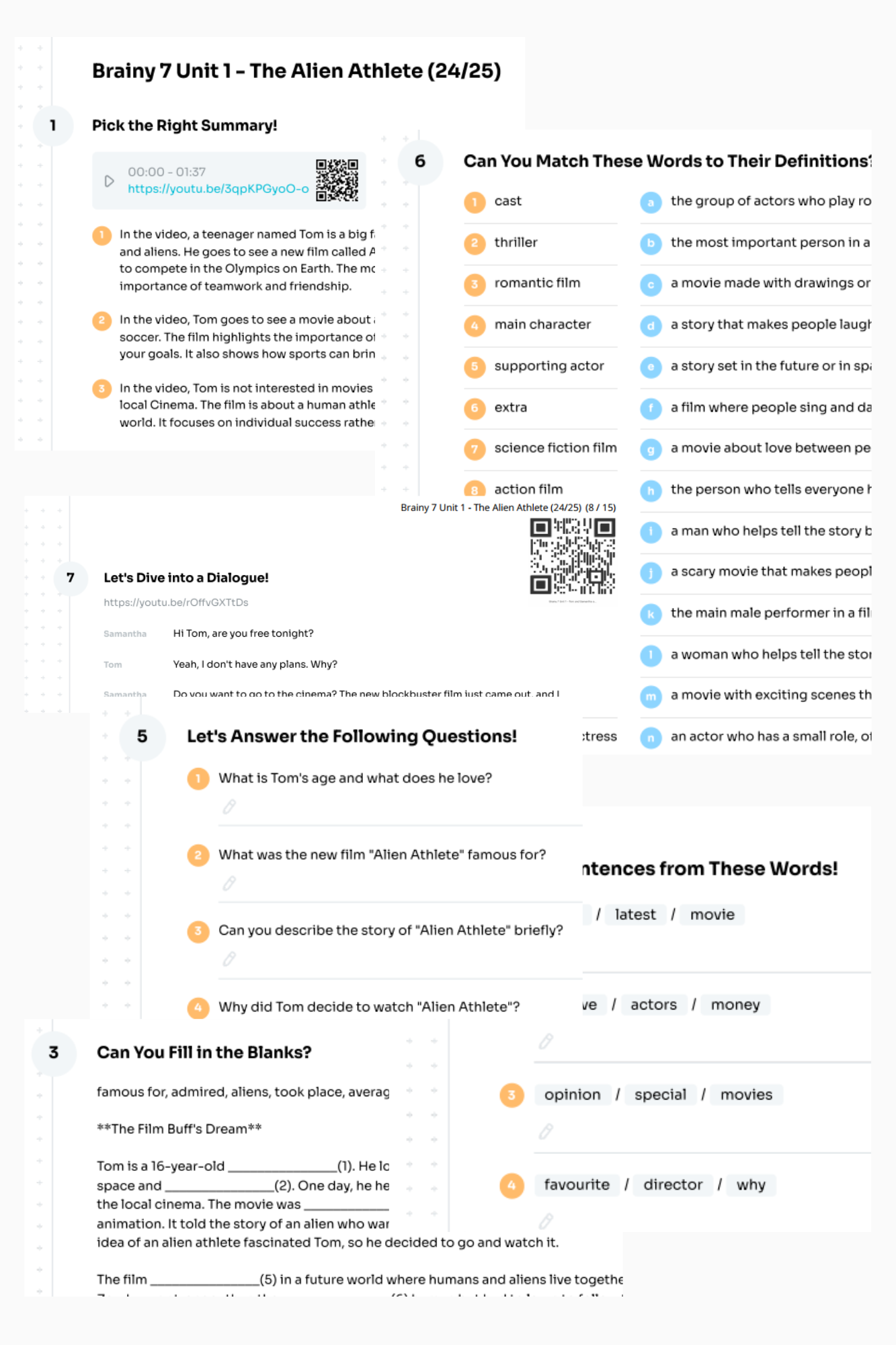 Materiał został opracowany na podstawie działu pierwszego z podręcznika Brainy 7. Całe słownictwo z tego działu w postaci testów możesz znaleźć tutaj. Niniejszą kartę pracy możesz wykorzystać do przeprowadzenia całej lekcji w zakresie słuchania, czytania, konwersacji, słownictwa oraz pisania. Możesz też podzielić lekcję na ćwiczenie każdej z tych umiejętności z osobna, gdyż każde zadanie zostało umieszczone na osobnej stronie.