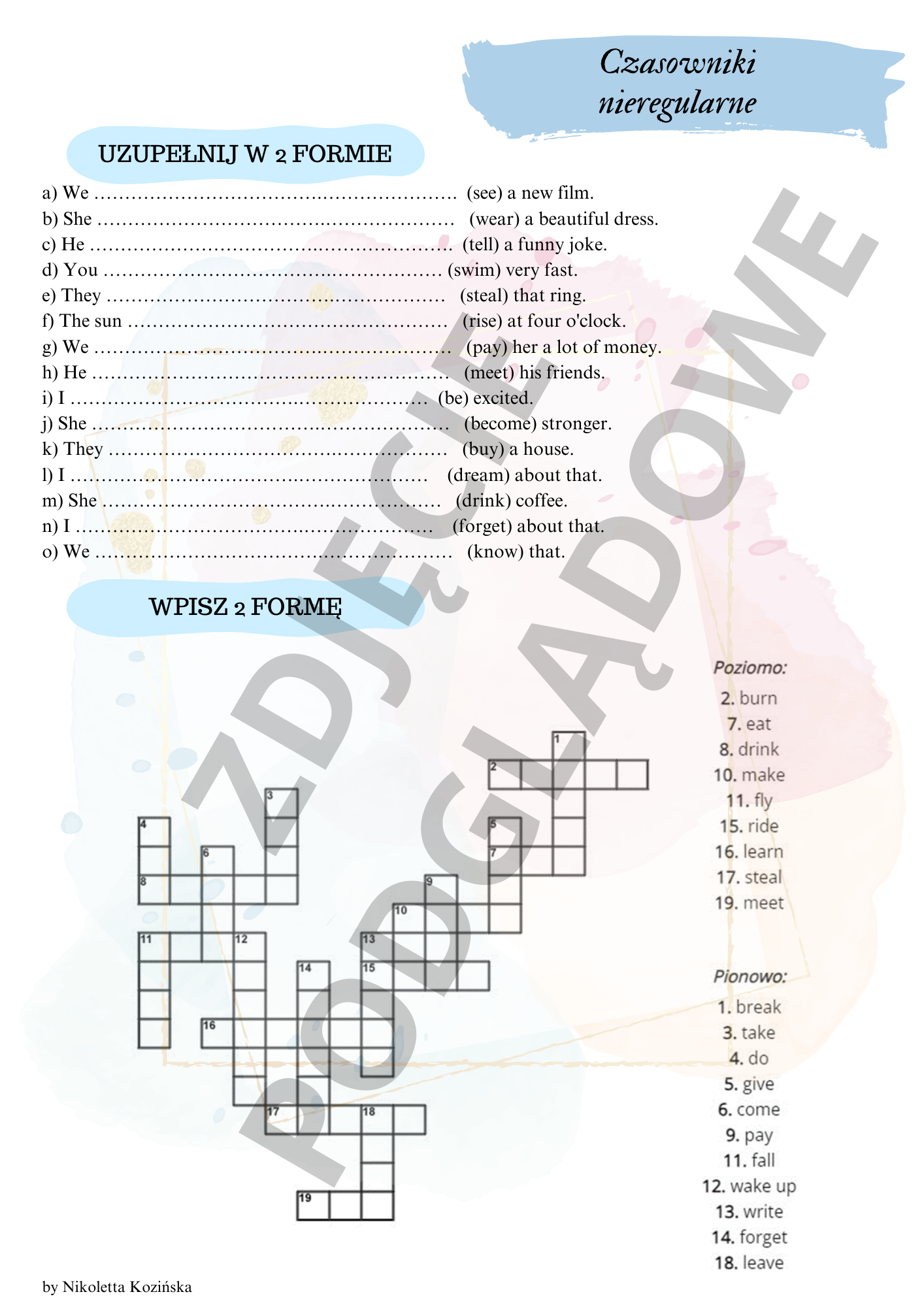 - czasowniki nieregularne (3 zadania, łącznie 60 przykładów)