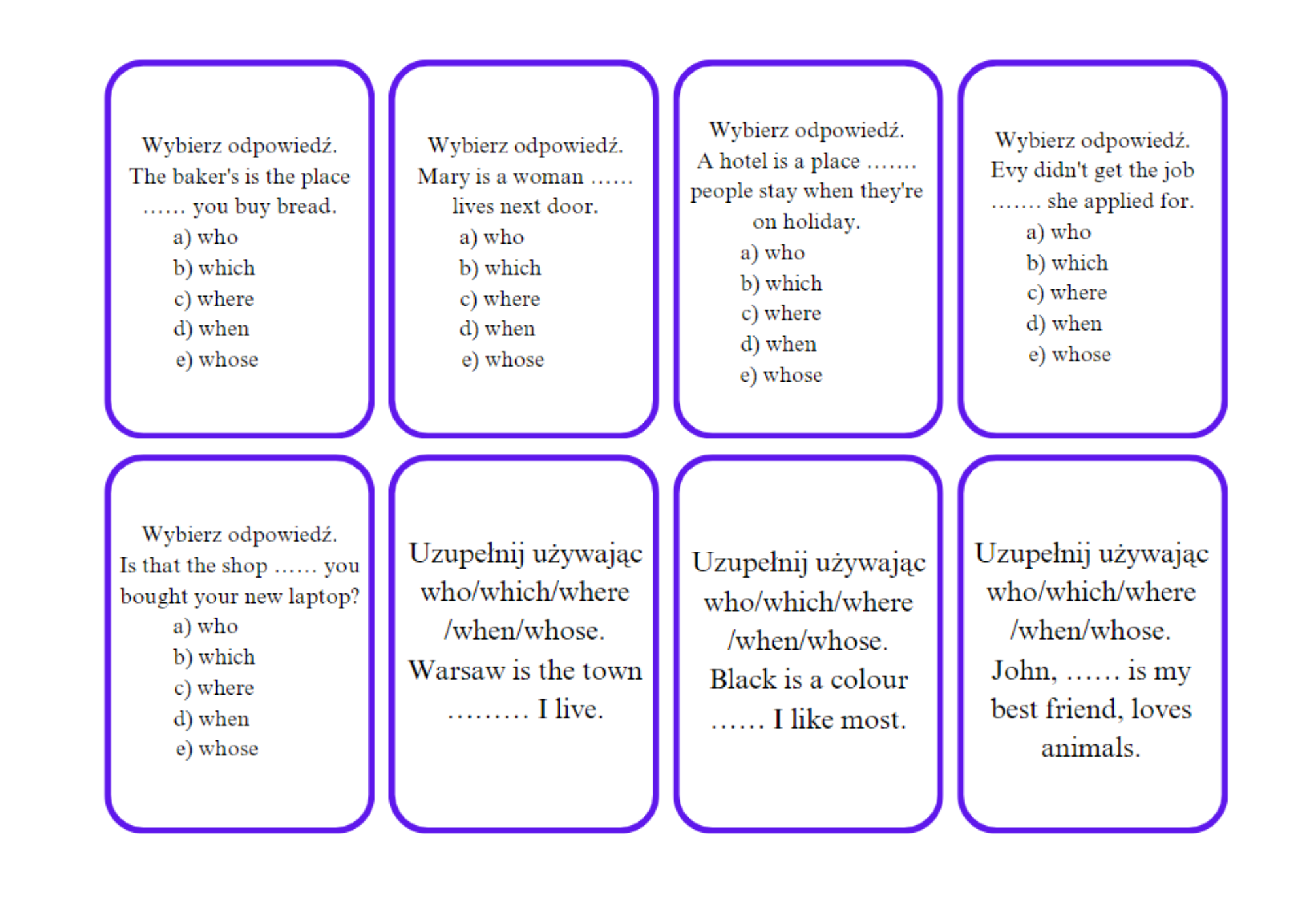 - defining relative clauses (2 zadania, łącznie 27 przykładów)