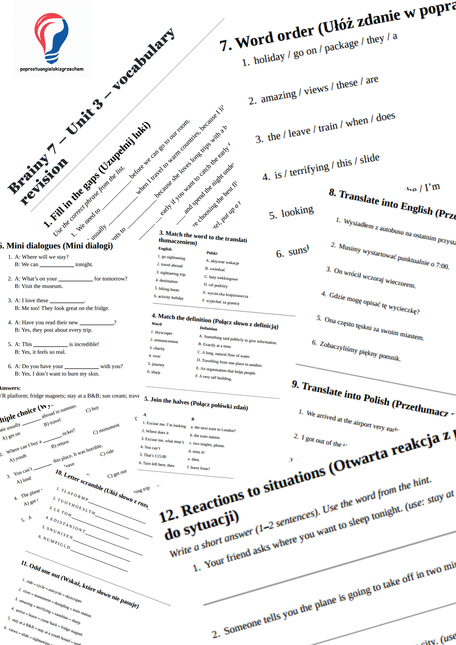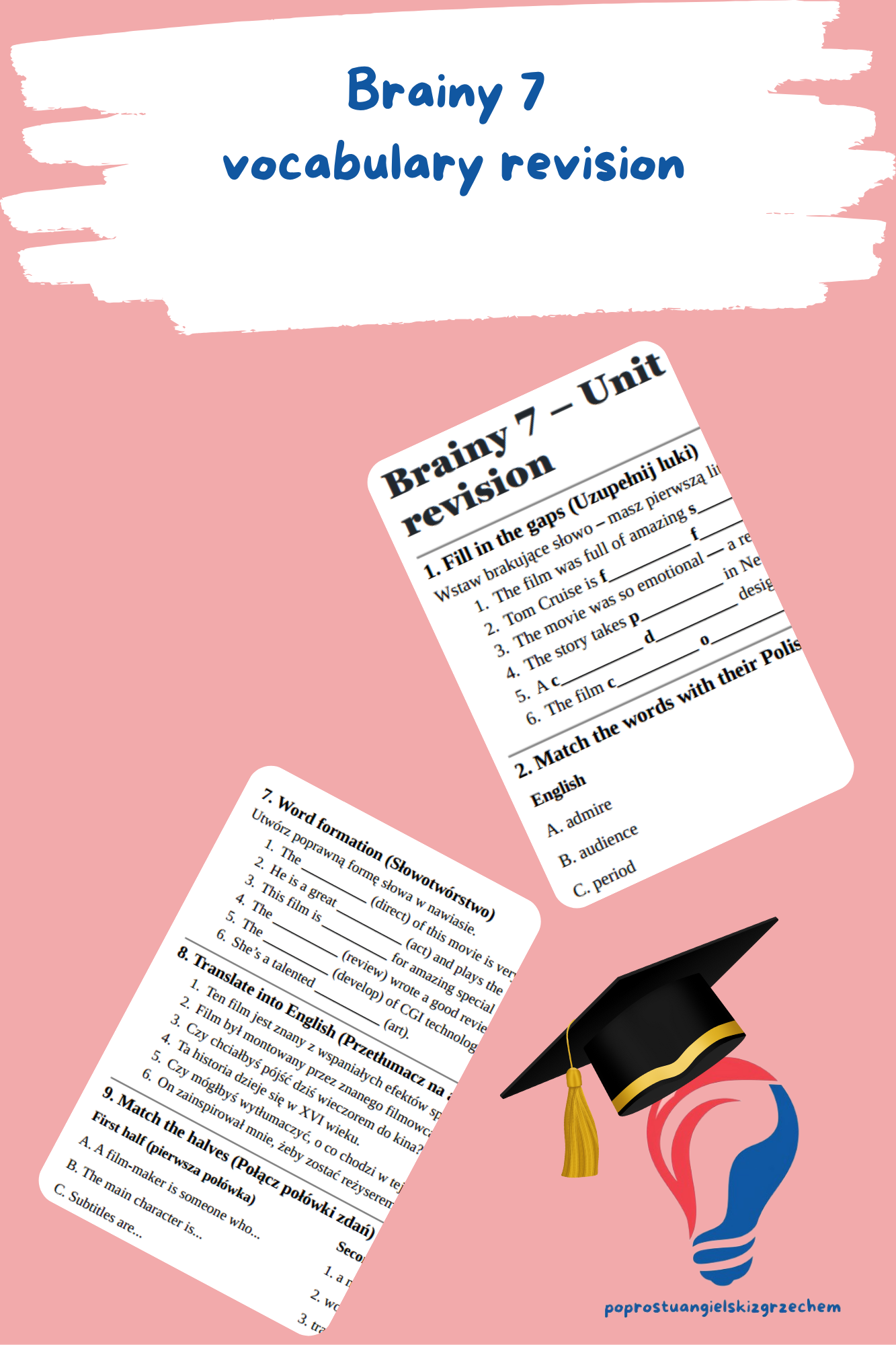 Dwanaście zadań na słownictwo do działu trzeciego z podręcznika Brainy 7. Słownictwo z działu trzeciego w postaci testów znajdziesz tutaj, a kartę pracy tutaj Niniejsze zadania możesz wykorzystać do przeprowadzenia powtórki, kartkówki lub do utrwalenia materiału ze słownictwa.