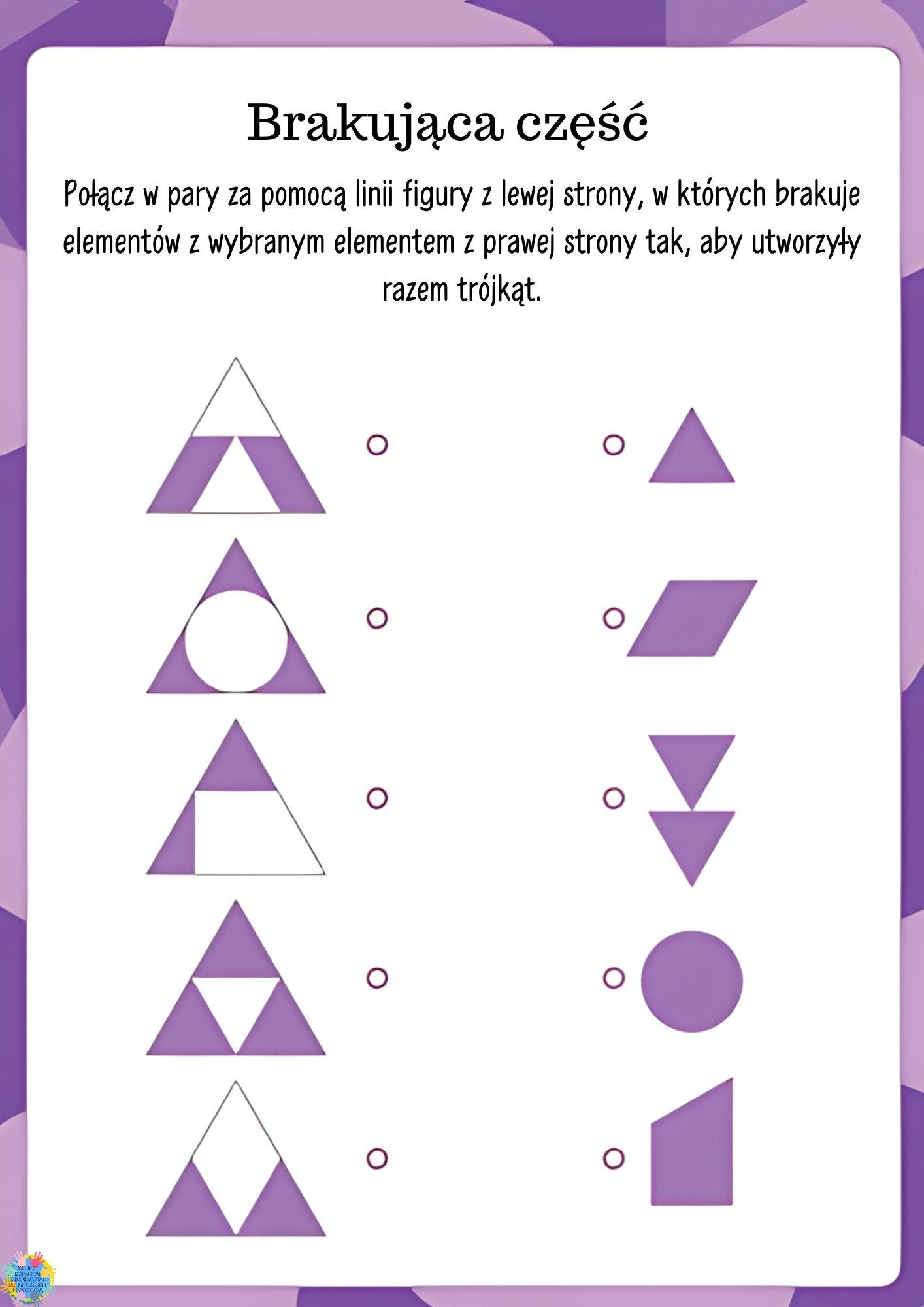Ten zestaw zadań jest idealną okazją do rozwijania zdolności logicznego, analitycznego oraz kreatywnego myślenia dziecka, jak również jego umiejętności percepcji przestrzennej otaczającego świata. W zadaniach dziecko ma za zadanie przeanalizować każdą z form na lewej stronie i odnaleźć brakującą część pośród form przedstawionych po prawej stronie. W trakcie wykonywania zadania, dodatkowo do aktywacji umysłowej, skupiona zostanie uwaga dziecka, co korzystnie wpłynie na jego rozwój i ogólny proces edukacji.