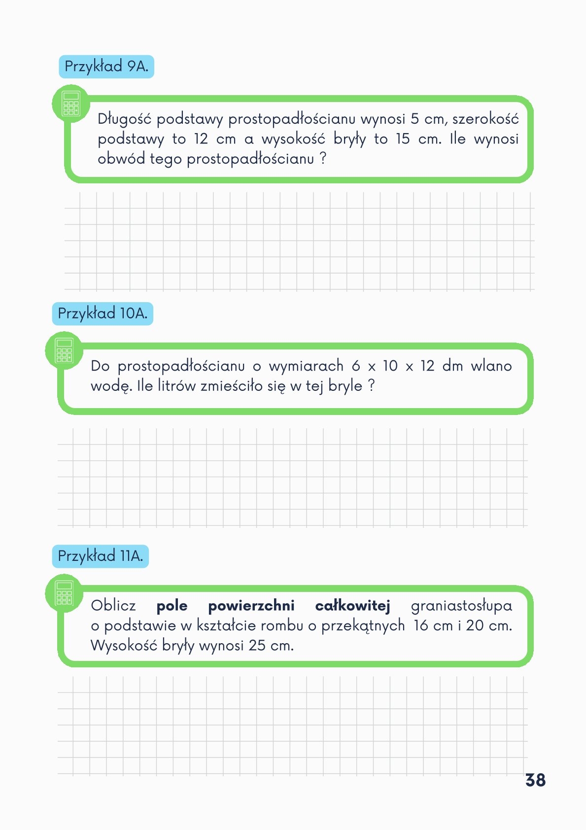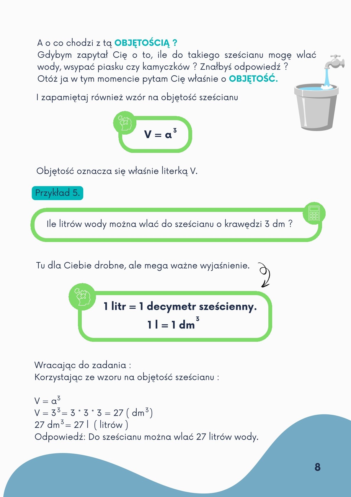 Wszystko opatrzone rysunkami, opisane. Wykorzystane wzory na pola całkowite brył i objętości. Wszystko co potrzebne uczniowi na egzaminie. Zadania rozwiązane ( 21) i do samodzielnego rozwiązania (też 21). Dołączone także zadania oryginalne CKE (10) z egzaminów ósmoklasisty. Rozwiązania i odpowiedzi.