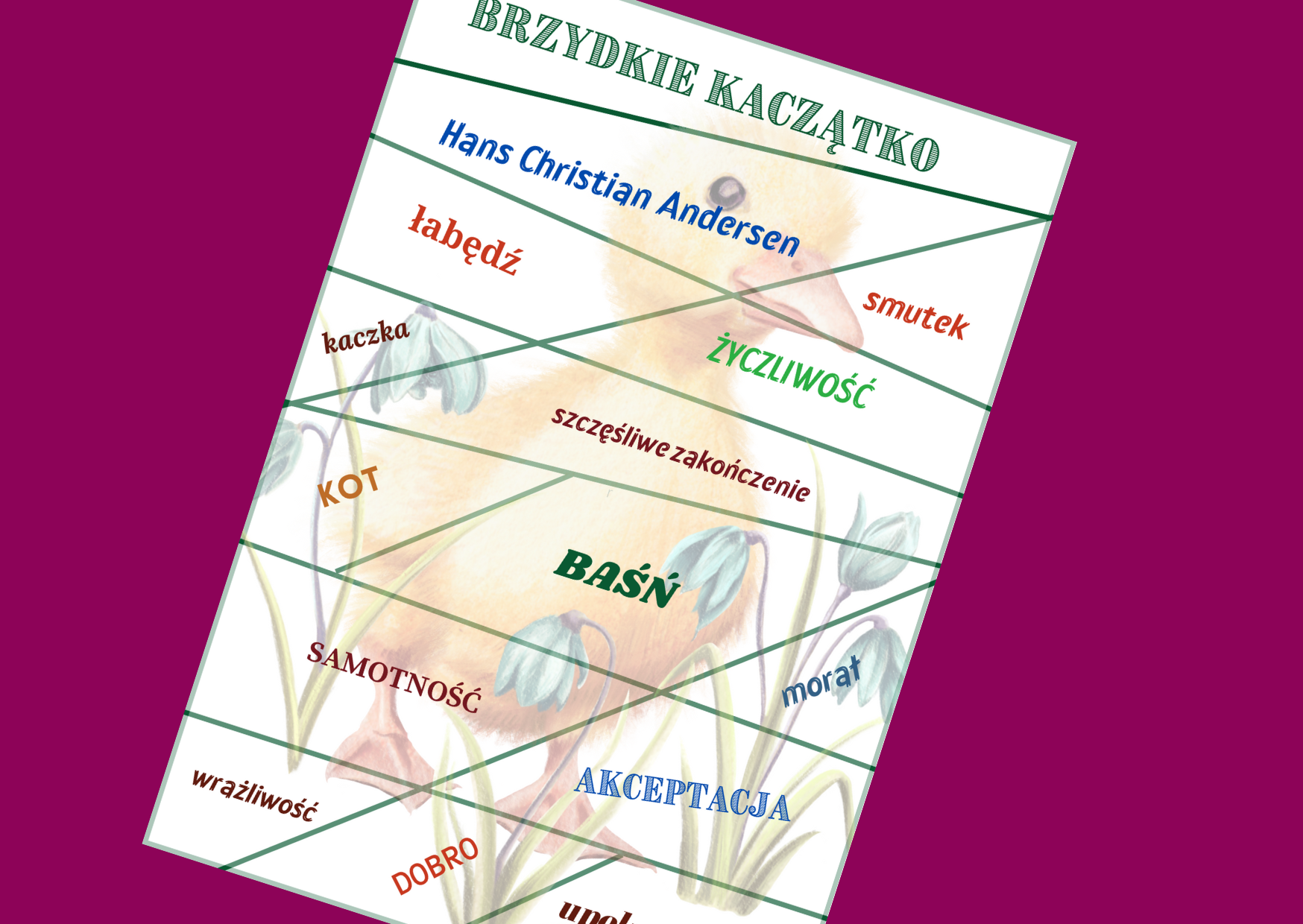 Puzzle dotyczące wyrazów związanych z baśnią "Brzydkie kaczątko".