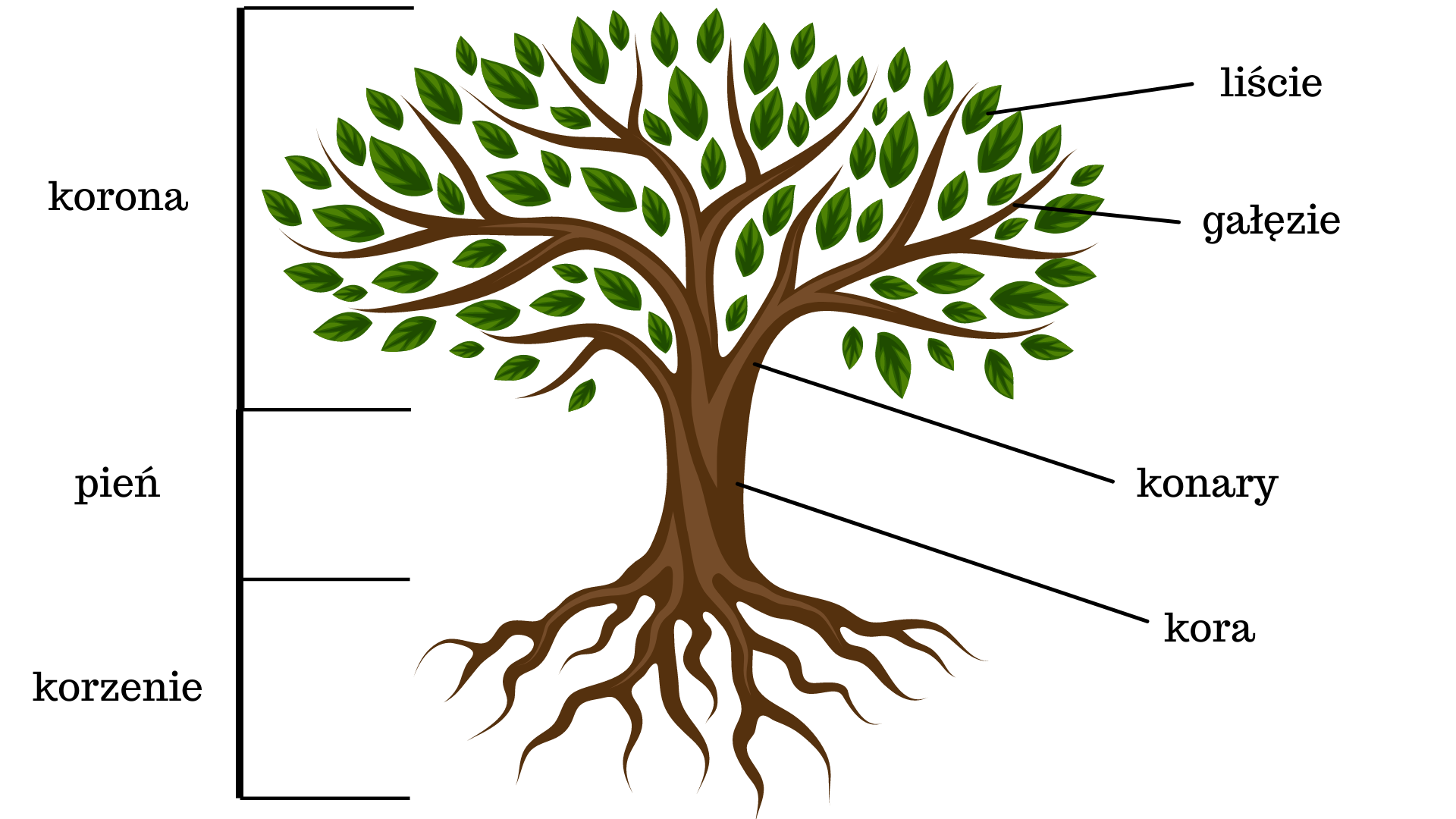 Budowa drzewa - części drzewa - to grafika przedstawiająca budowę drzewa.