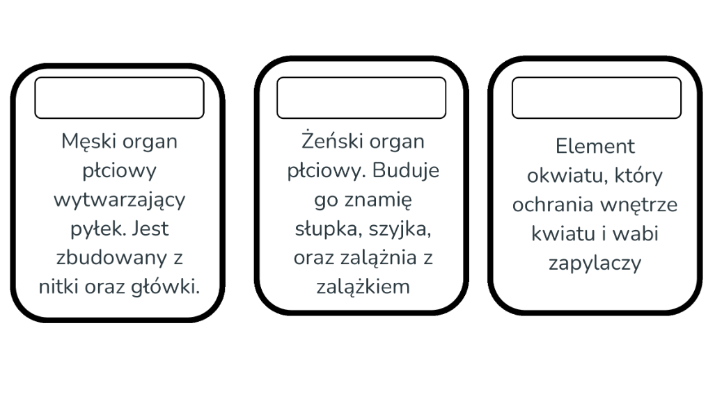 Materiał zawera karty z elementami budującymi kwiat. Do każdego elementu są dopasowane trzy karty: