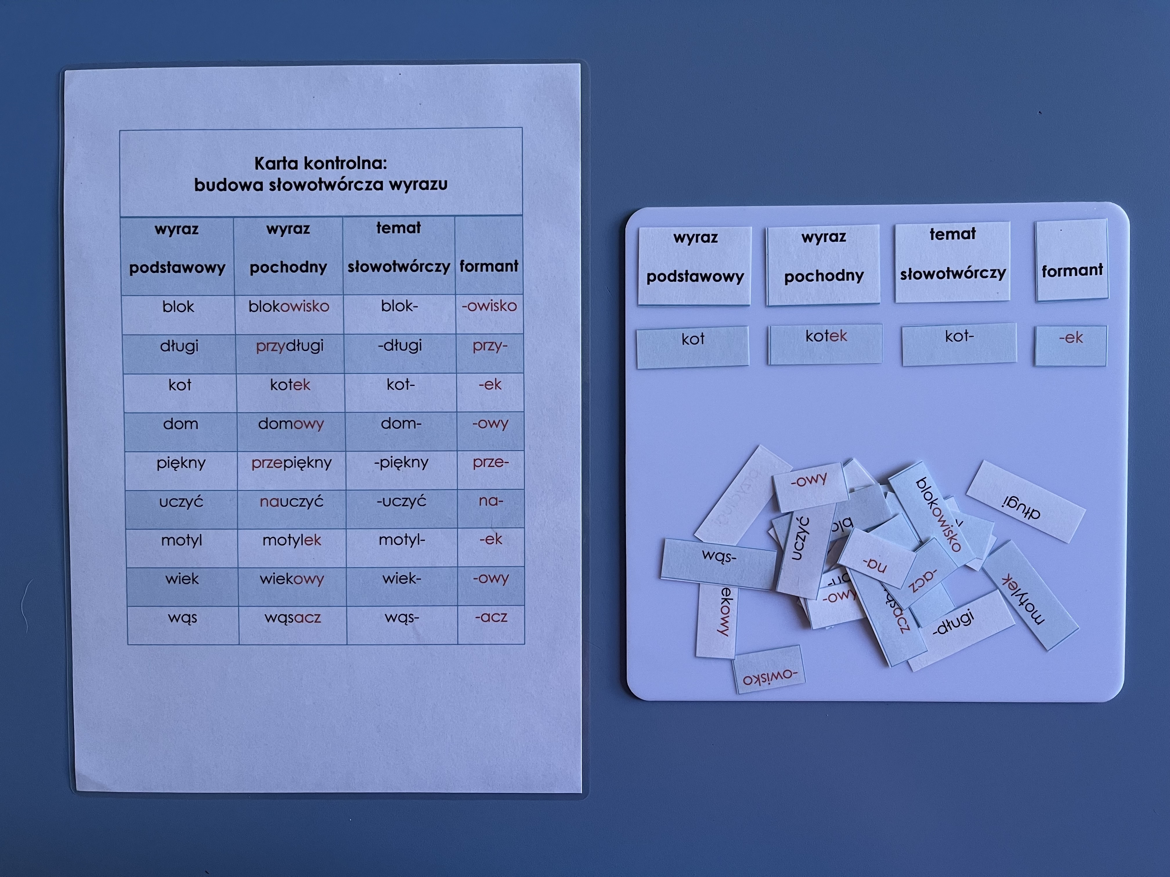Zadaniem ucznia jest odpowiednio dopasować wyraz podstawowy, wyraz pochodny, temat słowotwórczy i formant. Uczeń ćwiczy tutaj przede wszystkim nazewnictwo, które jest dość skomplikowane i często się myli. Na karcie kontrolnej sprawdza poprawność wykonanego zadania.