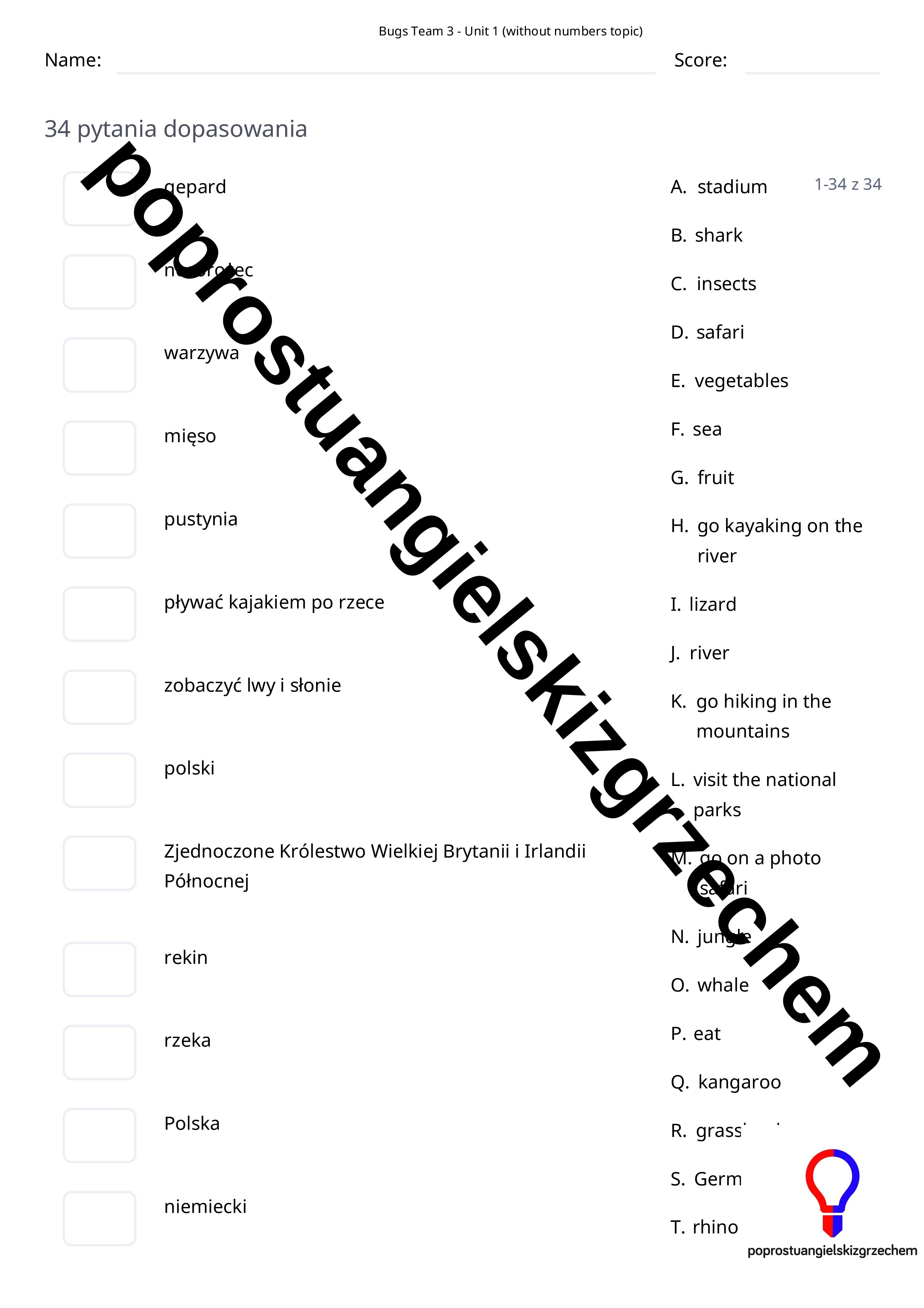 Zestaw zawiera 34 słówka z działu pierwszego do podręcznika Bugs Team 3. Testy podzielone na 4 kategorie zadań (prawda/fałsz, dopasuj, wielokrotny wybór, pisemny)