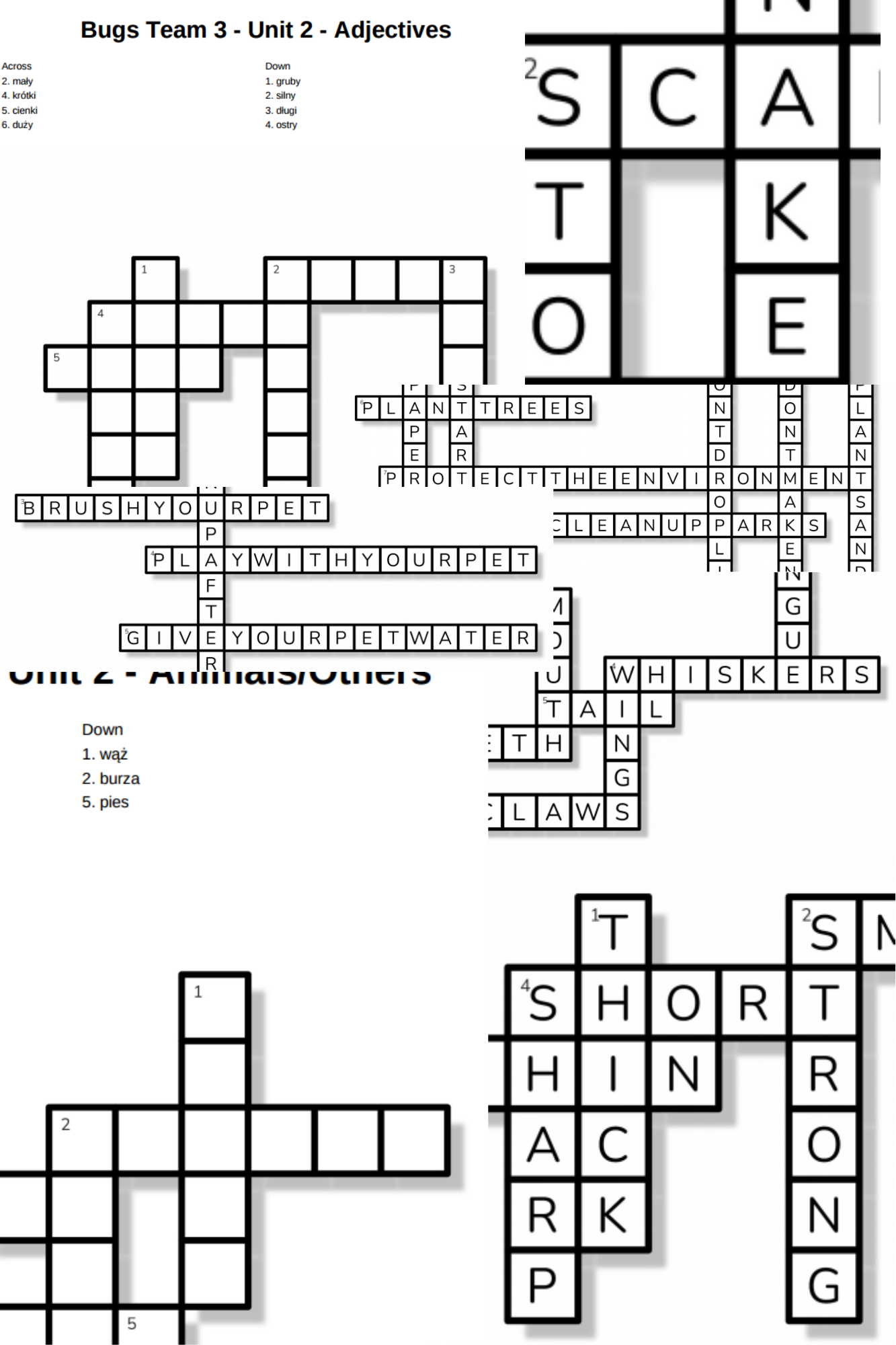Zestaw zawiera 5 krzyżówek obejmujących słówka z działu drugiego do podręcznika Bugs Team 3: