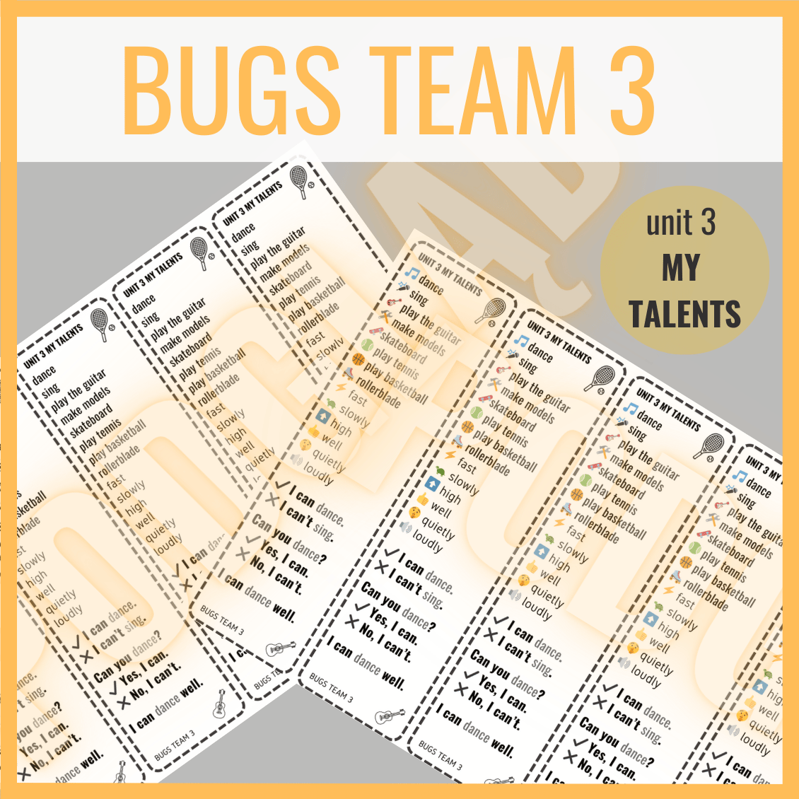Gotowe zakładki ze słownictwem oraz najważniejszymi zwrotami z unitu 3 MY TALENTS do podręcznika Bugs Team 3 wydawnictwa MACMILLAN, praktyczne, przydatne i estetyczne, porządkują słownictwo i ułatwiają uczniom szybkie powtórki 📚✨
