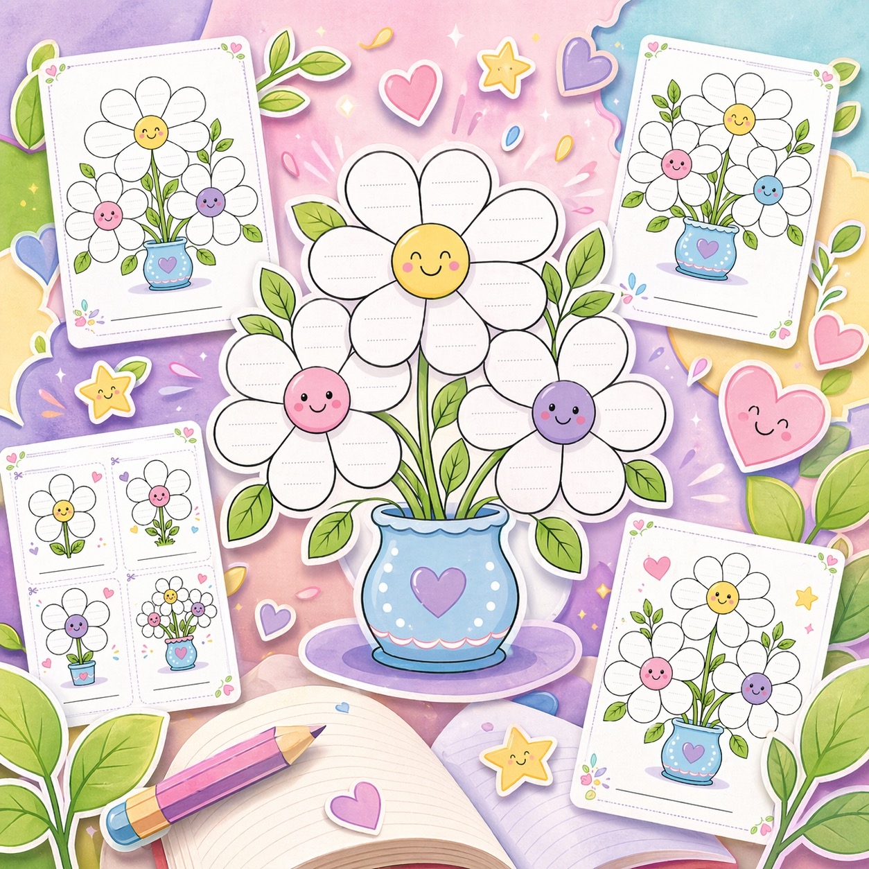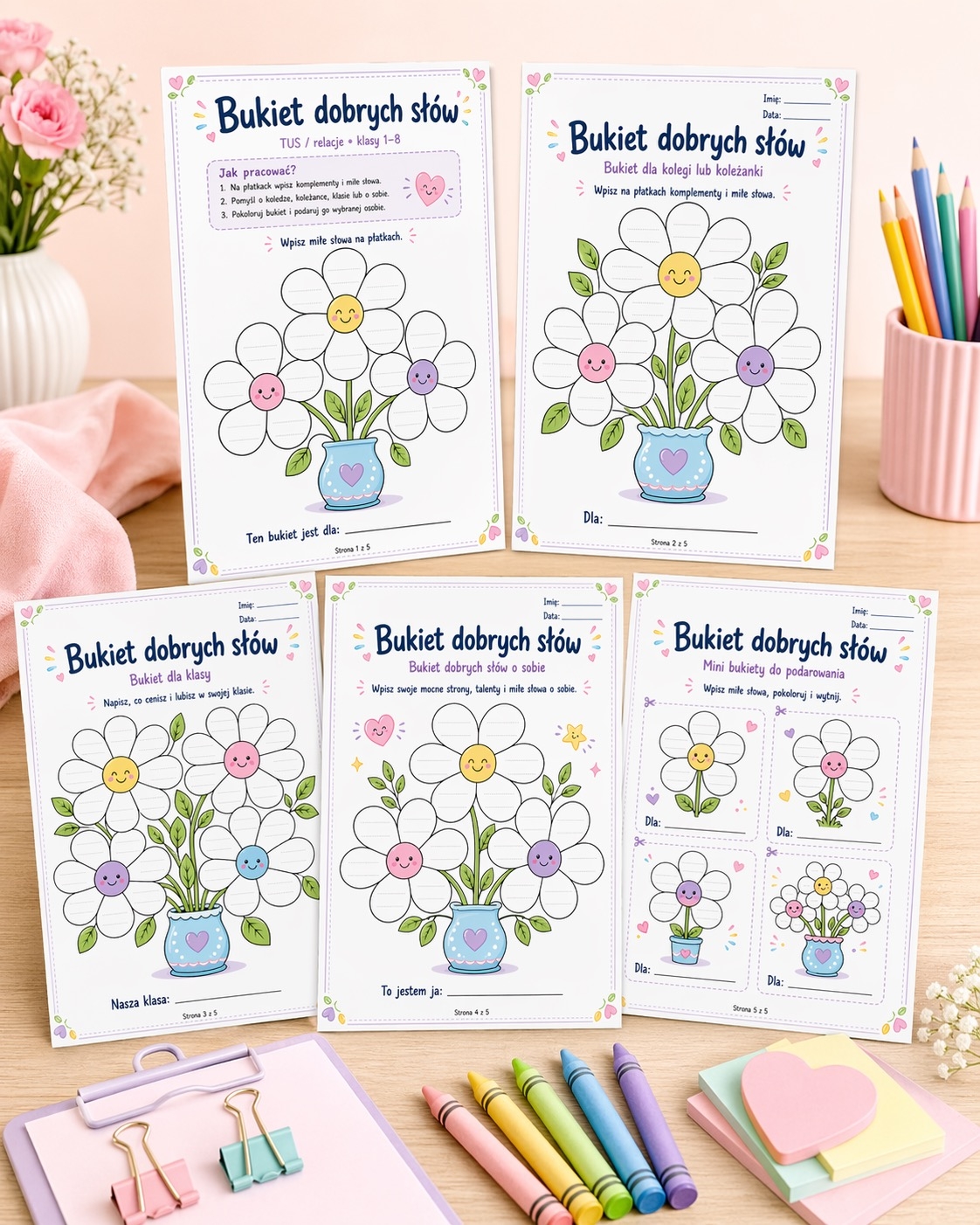 W zestawie znajduje się 5 stron z kwiatami i płatkami do uzupełniania komplementami, miłymi słowami i pozytywnymi skojarzeniami. Dzieci mogą przygotować bukiet dla kolegi, koleżanki, całej klasy, a także dla samych siebie.