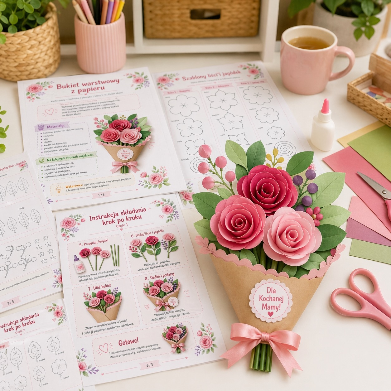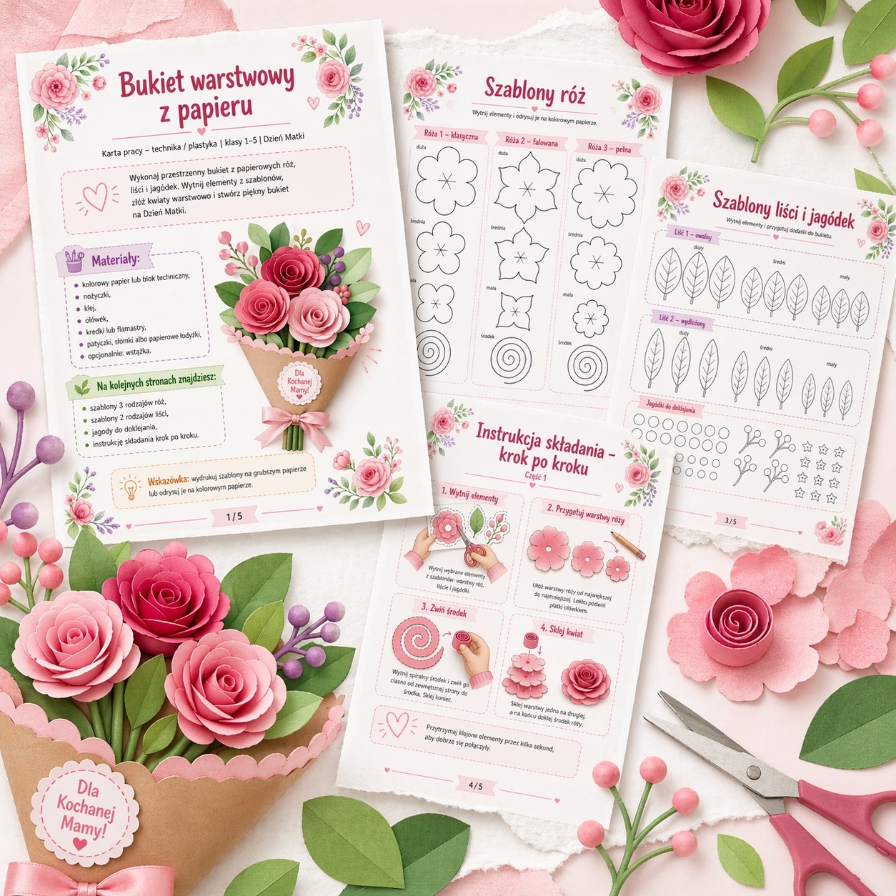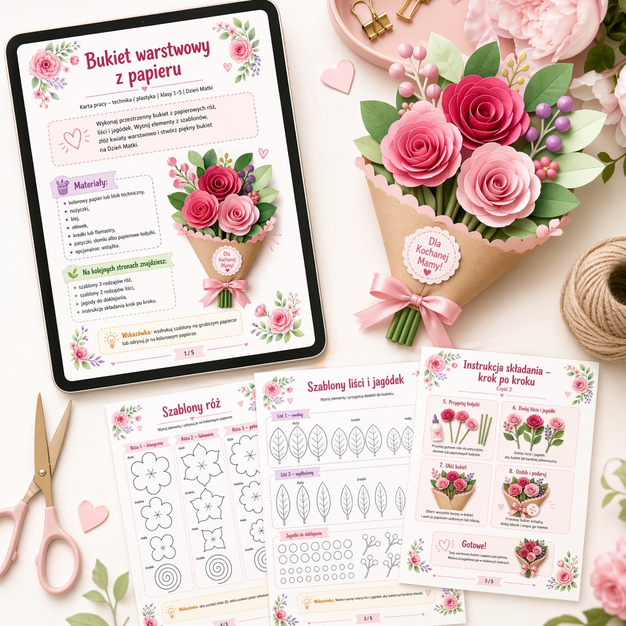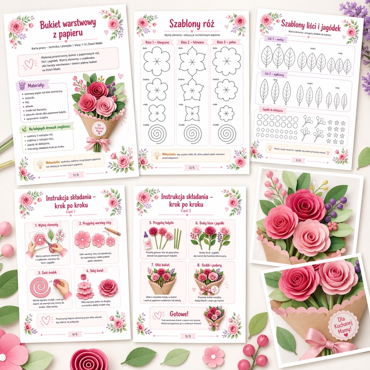 „Bukiet warstwowy z papieru” to urocza karta pracy z techniki i plastyki, idealna dla uczniów klas 1–5 na Dzień Matki. Zawiera gotowe szablony 3 rodzajów róż, 2 rodzajów liści oraz jagódek do doklejania, a także prostą instrukcję składania krok po kroku. Dzięki temu dzieci mogą samodzielnie wykonać efektowny, przestrzenny bukiet z papieru, rozwijając przy tym sprawność manualną, dokładność i kreatywność. To piękna praca plastyczno-techniczna, która może stać się wyjątkowym prezentem dla mamy. ✂️🌹🎀