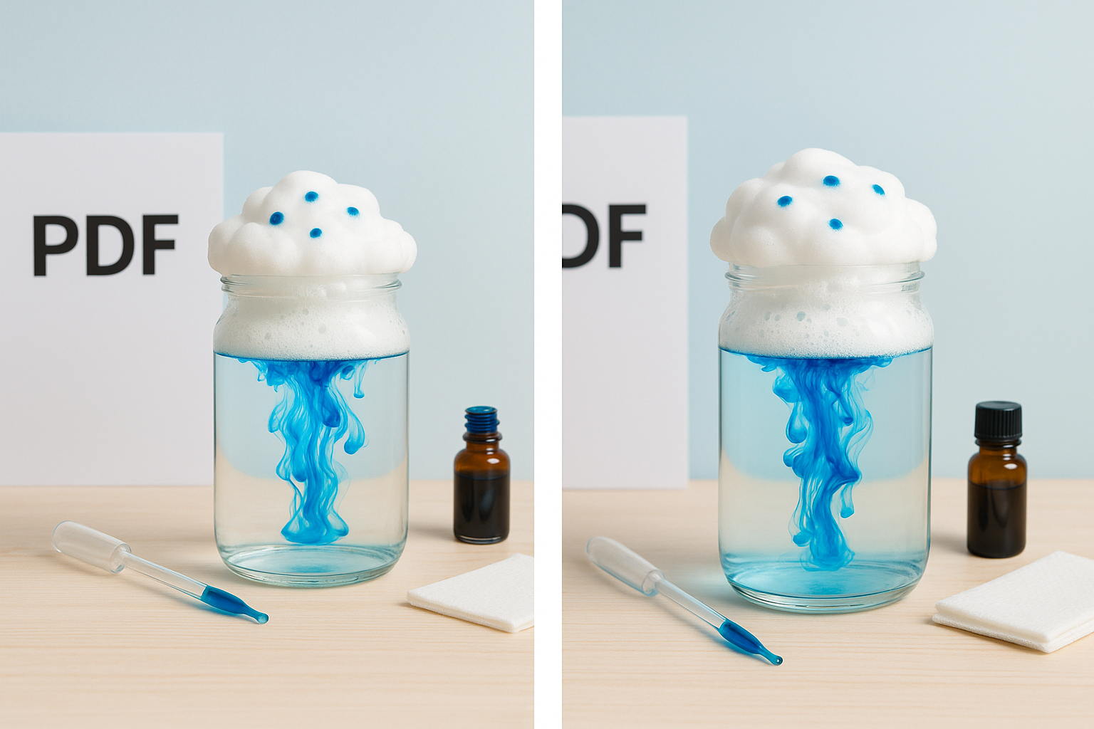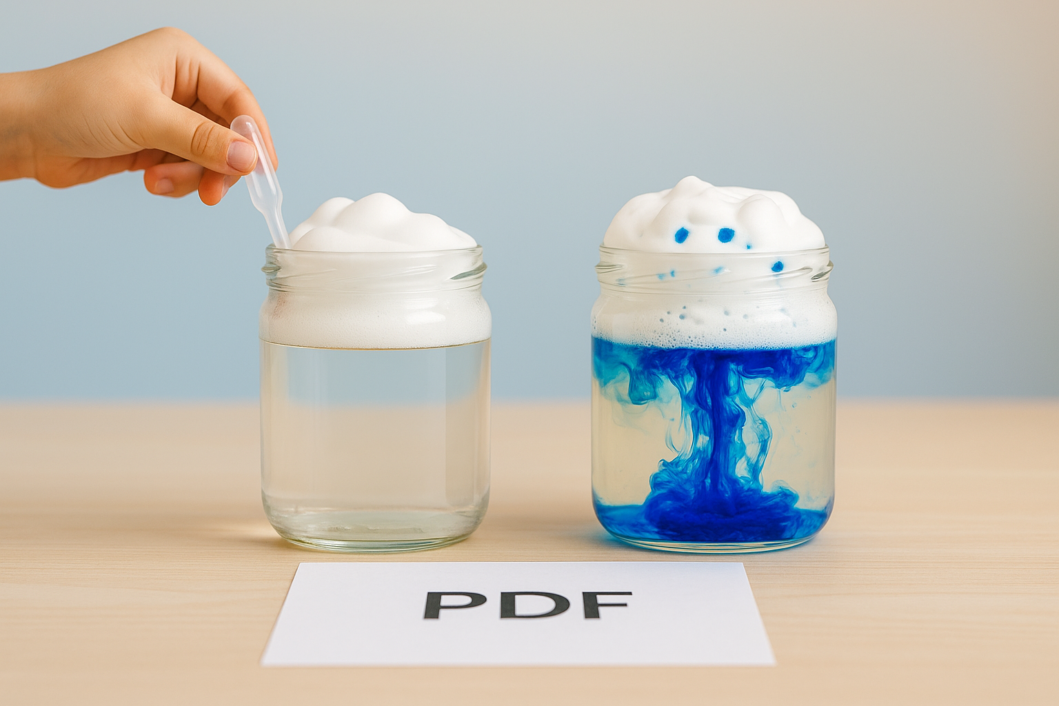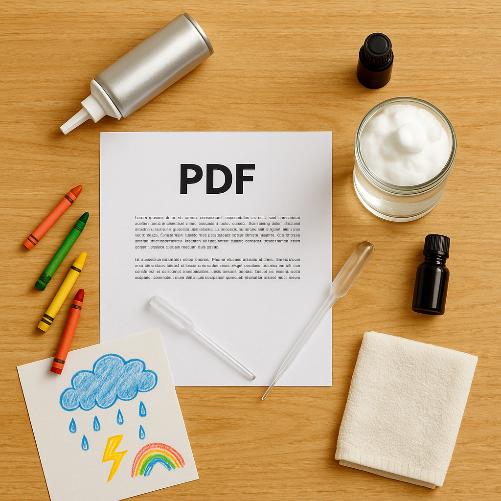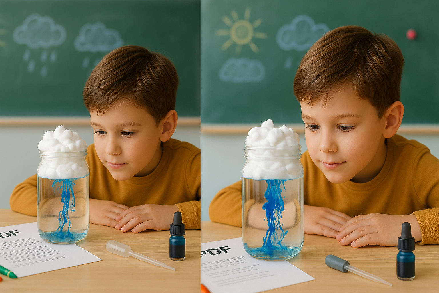 Ten kolorowy, gotowy do wydruku materiał PDF pokaże dzieciom krok po kroku, jak samodzielnie stworzyć zjawisko pogodowe w słoiku – od pierwszych „chmurek” z pianki do golenia, aż po „deszcz” barwnika spadający w dół. Wszystko w formie przejrzystej instrukcji obrazkowej z prostym językiem, idealnym dla dzieci.
