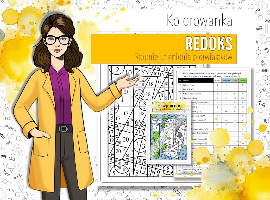 Kolorowanka chemiczna, wprowadzająca do tematu reakcji REDOKS. Zadaniem uczniów jest ustalenie stopni utlenienia podanych pierwiastków chemicznych, a następnie pokolorowanie łamigłówki według wzoru.