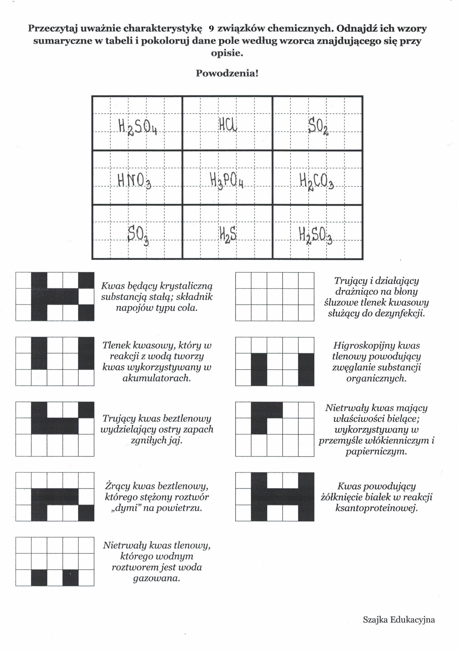 Zadaniem uczniów jest uważne przeczytanie charakterystyk 9 związków chemicznych. Należy odnaleźć ich wzory sumaryczne w tabeli i pokolorować dane pole według wzorca znajdującego się przy opisie. Jeśli zadanie zostanie wykonane poprawnie zostanie odkryty tajemniczy napis ;). Życzę dobrej zabawy ?